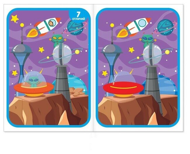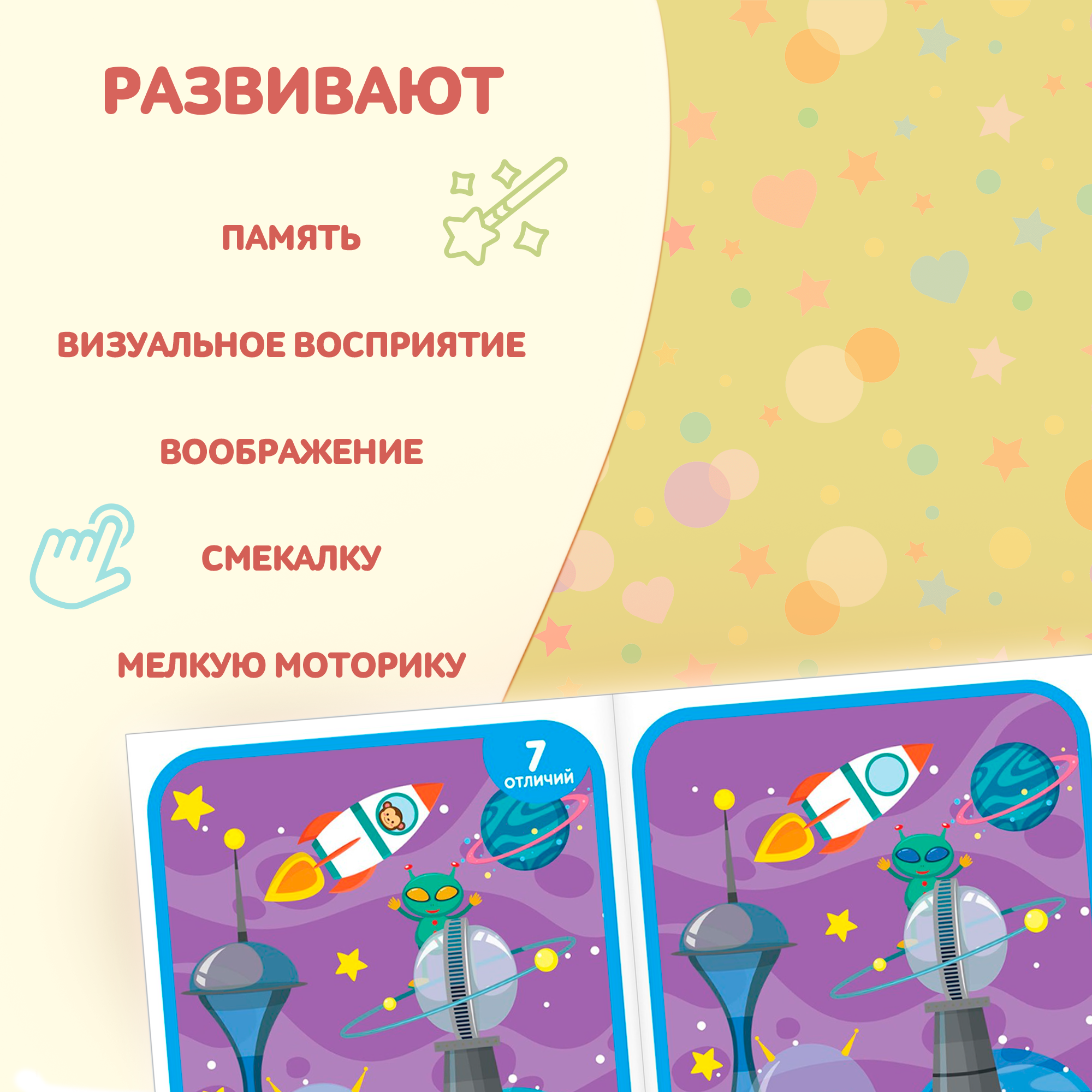 На каждой странице представлены яркие, красочные картинки лесных животных, домашних питомцев, птичек, рыбок, космических ракет и много всего интересного. Отличия между ними лишь в нескольких деталях. Дополнительно в книжке представлены задания: дорисовать и раскрасить картинки. Одно и то же задание можно выполнять несколько раз, улучшая свой результат.