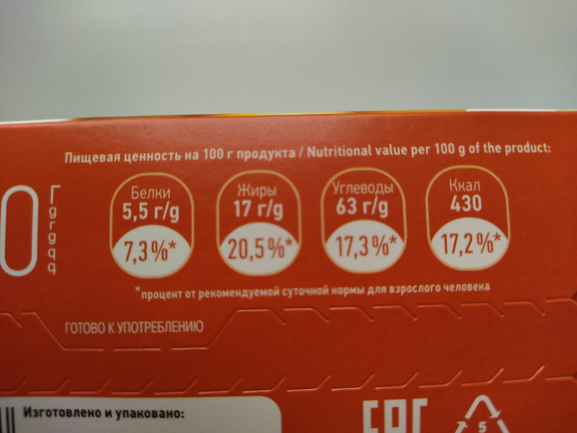 | Состав | Сахар мука пшеничная в/с заменитель молочного жира (рафинированные дезодорированные масла в натуральном и модифицированном виде (пальмовое масло и его фракции, подсолнечное масло), эмульгаторы (е471, е322), антиокислители (е320, е321)) вода продукты яичные глюкозный сироп мёд молоко сухое обезжиренное глазурь кондитерская тёмная (сахар, заменитель масла какао нетемперируемый лауринового типа (масло пальмоядровое рафинированное дезодорированное гидрогенизированное, эмульгаторы (е492, е322)), какао-порошок, ароматизатор, эмульгаторы (е322, е476)) сыворотка молочная сухая эмульгатор (е471, е475) разрыхлитель (е500ii, e450i) сахар жжёный карамелизованный (сахар жжёный карамелизованный, вода) влагоудерживающий агент (глицерин) уплотнитель (е509) консерванты (пропионат натрия, сорбиновая кислота, сорбат калия) загуститель (гуаровая камедь) регуляторы кислотности (лимонная кислота, винная кислота) ароматизаторы. |