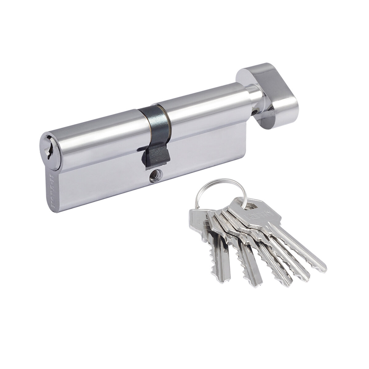 Латунный цилиндр для межкомнатных и входных дверей. 5 пинов, в комплекте 5 английских ключей из латуни. Цилиндр имеет штифт из закаленной стали против высверливания и вертушку для удобного запирания изнутри помещения без использования ключа. Ресурс работы более 100.000 циклов. Длину цилиндра подбирайте исходя из толщины двери, с небольшим запасом под накладку. Гарантия на работу цилиндра 5 лет