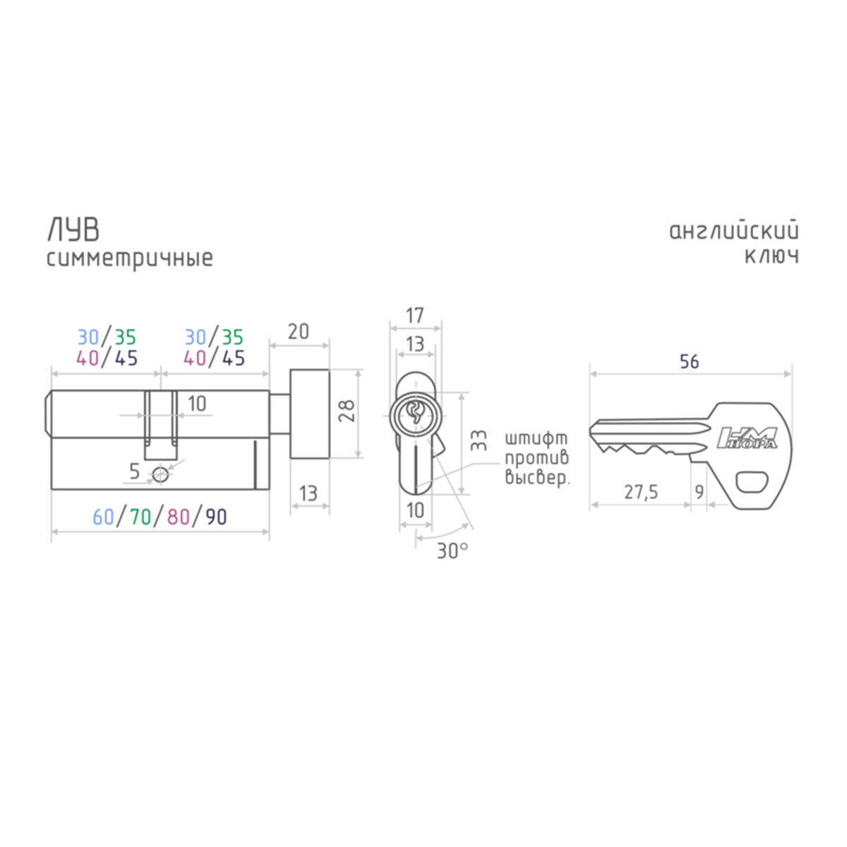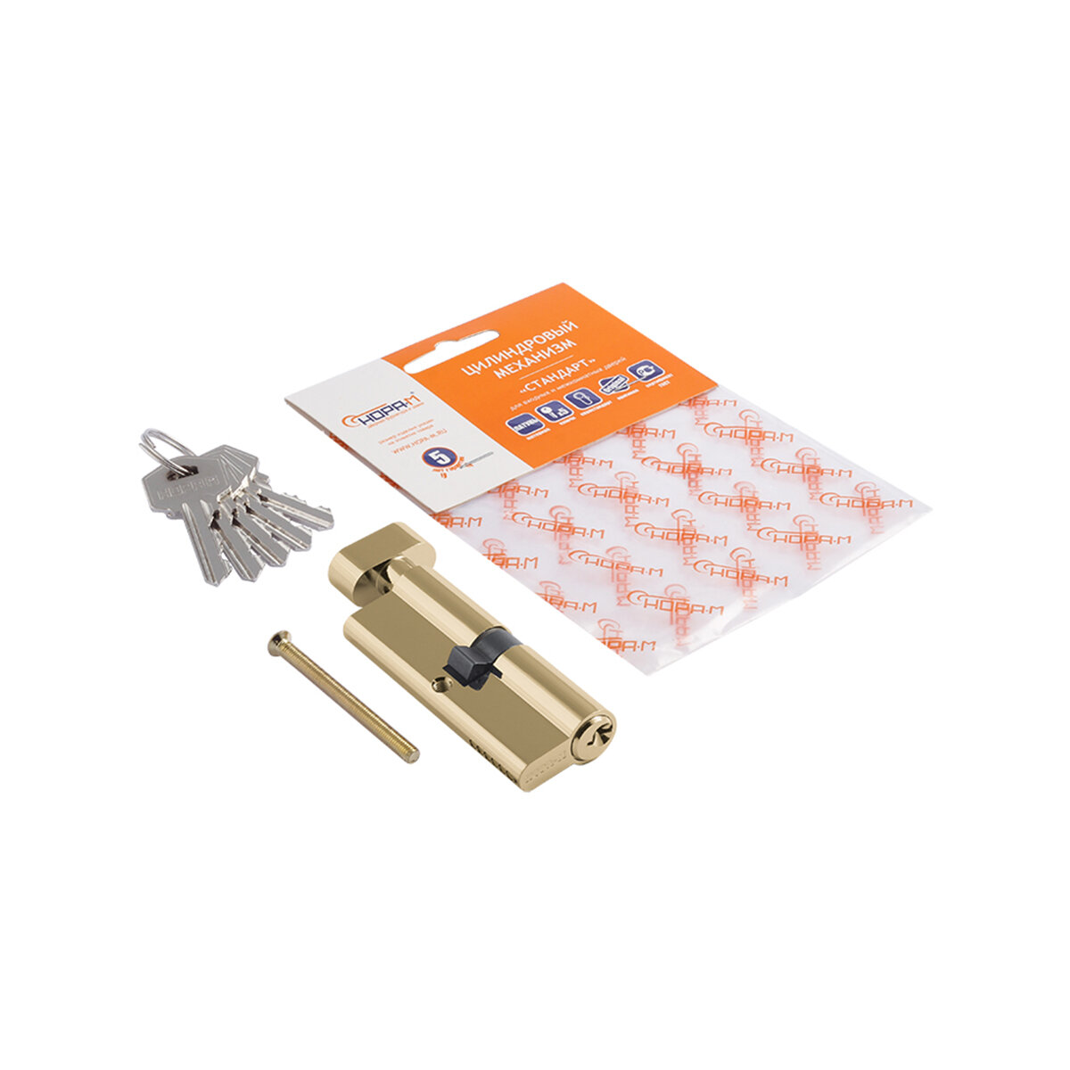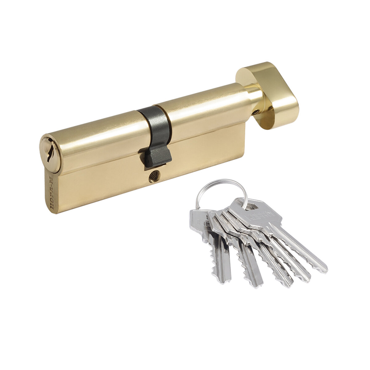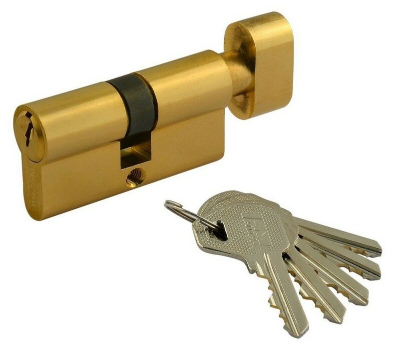 Латунный цилиндр для межкомнатных и входных дверей. 5 пинов, в комплекте 5 английских ключей из латуни. Цилиндр имеет штифт из закаленной стали против высверливания и вертушку для удобного запирания изнутри помещения без использования ключа. Ресурс работы более 100.000 циклов. Длину цилиндра подбирайте исходя из толщины двери, с небольшим запасом под накладку. Гарантия на работу цилиндра 5 лет