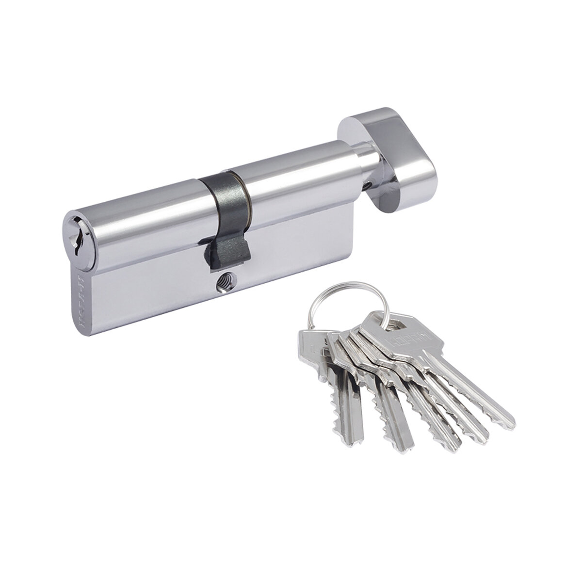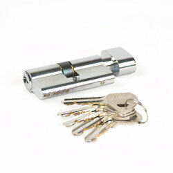 Латунный цилиндр для межкомнатных и входных дверей. 5 пинов, в комплекте 5 английских ключей из латуни. Цилиндр имеет штифт из закаленной стали против высверливания и вертушку для удобного запирания изнутри помещения без использования ключа. Ресурс работы более 100.000 циклов. Длину цилиндра подбирайте исходя из толщины двери, с небольшим запасом под накладку. Гарантия на работу цилиндра 5 лет