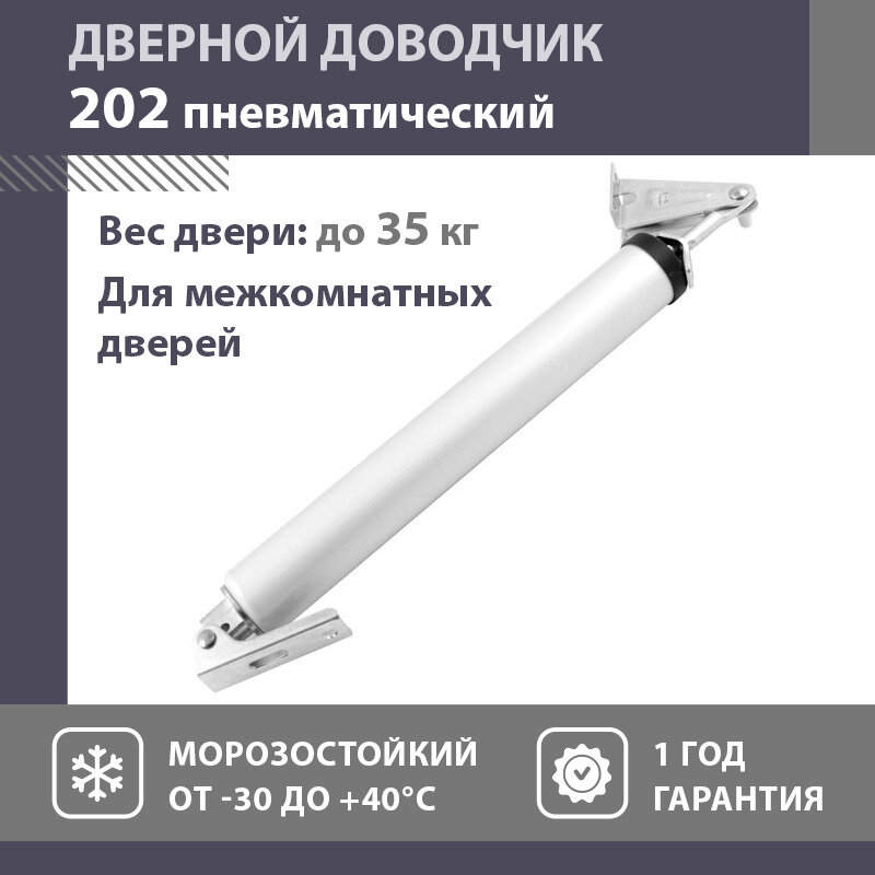 Межкомнатный пневматический доводчик для легких дверей весом до 35 кг. Универсальный, подходит для установки на левые и правые двери. Скорость закрывания регулируется клапаном. Фиксирует двери в открытом положении (ручное включение/отключение). Диапазон рабочей температуры от -30 до +40 градусов. Цвет серебро. Гарантия 1 год.