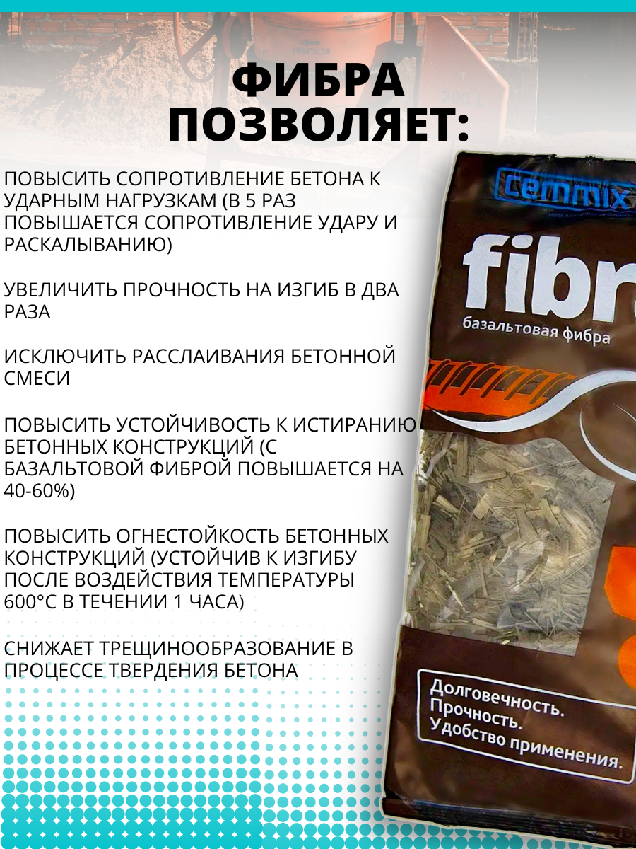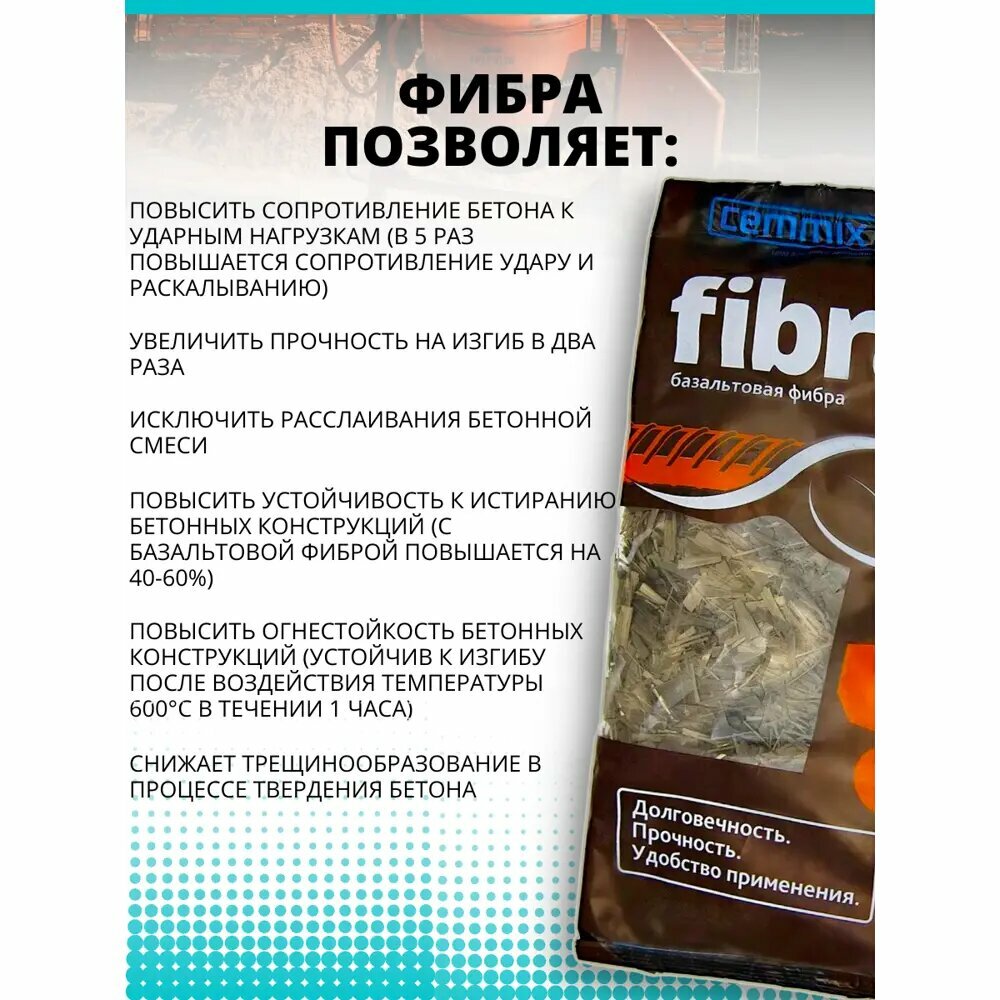 Cemmix базальтовая фибра (из ровинга) - экономичная альтернатива стальной сетке. Продукт увеличивает прочность бетона на изгиб, способствует предотвращению микротрещин, образующихся в бетоне в пластическом состоянии, предназначена для объёмного армирования бетонов, строительных растворов и композиционных материалов. Применяется с любыми сухими строительными смесями, а также бетоном самостоятельного замеса.