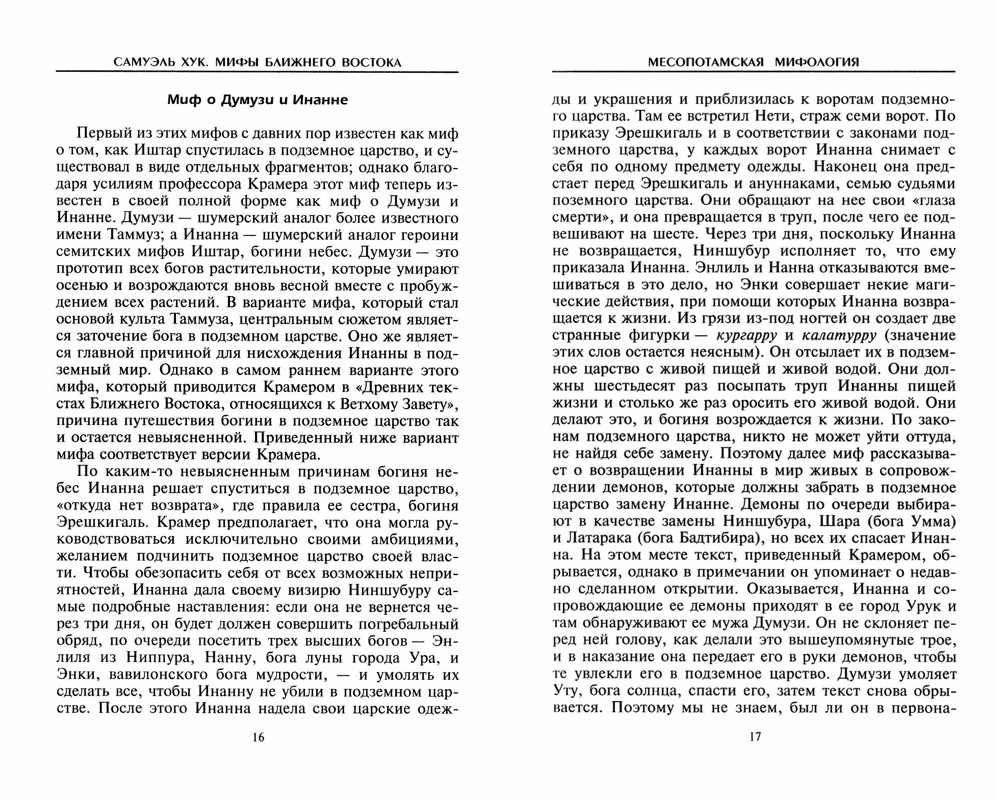 Книга «Ближневосточная мифология» (так точнее), по сути, представляет собой сравнительное рассмотрение шумерских, вавилонских, угаритских и хеттских религиозных представлений и кое-что из египетской мифологии за компанию. Само рассмотрение достаточно интересно, но, когда автор начинает «гармонию алгеброй поверять», т. е. выдвигать свои идеи о предназначении мифов, их классификации, то алгебра эта оказывается весьма заезженной. Вопросом «Откуда берется миф?» автор не задается. Вышесказанное занимает первую половину книги и является прелюдией к рассмотрению библейских сказаний, благо, в отличие от предыдущих глав, здесь материала более чем достаточно. Здесь уже не пересказ сюжетов, а их разбор на предмет интерпретации и заимствованности. В целом, читатель знакомится с авторским ИМХО (вообще, слово «возможно» употребляется очень часто). Ну а когда дело доходит до Нового Завета, то и вовсе вспоминается знаменитый разговор на Патриарших прудах (хотя, конечно же, автор, несомненно, грамотнее Михаила Берлиоза). Сам Самуэль Хук (1874-1968) – английский религиовед, президент Общества изучения Ветхого Завета. Данная книга появилась на свет в 1963 году.