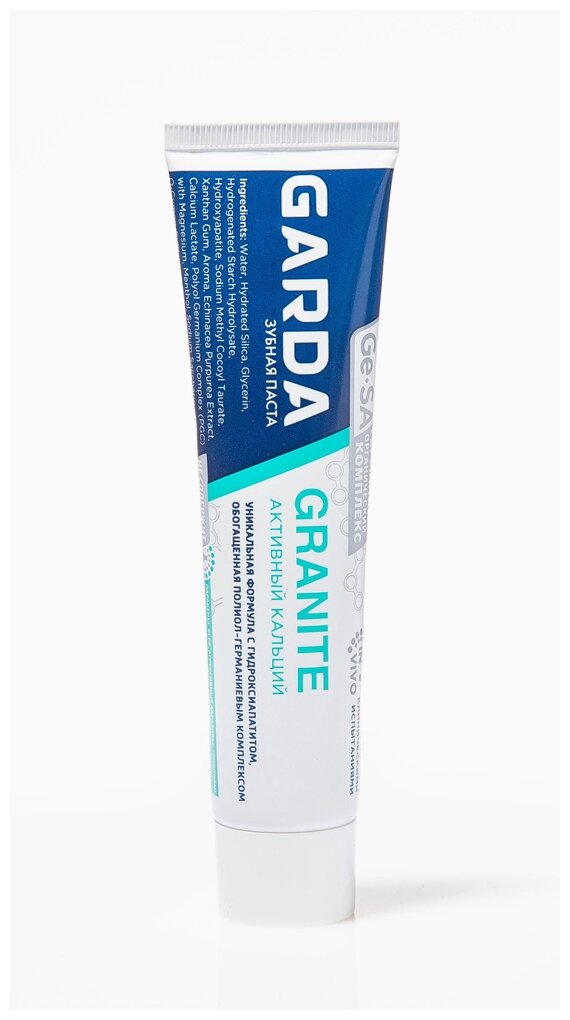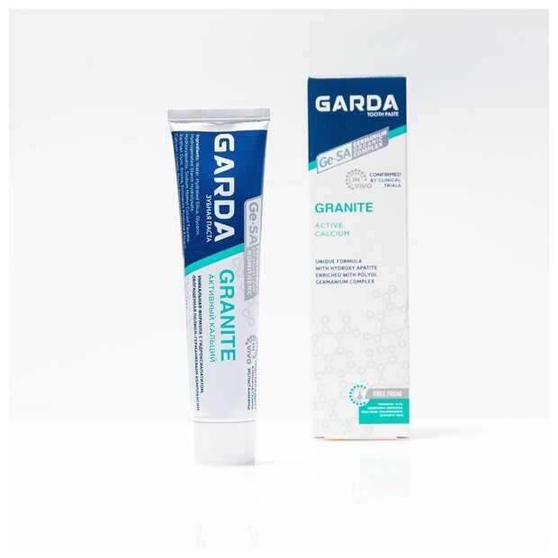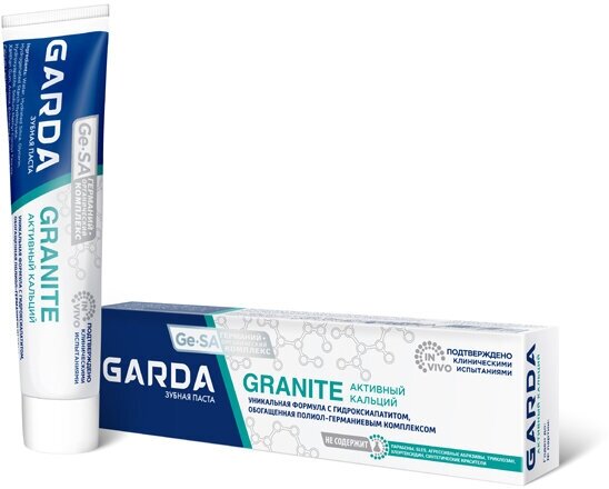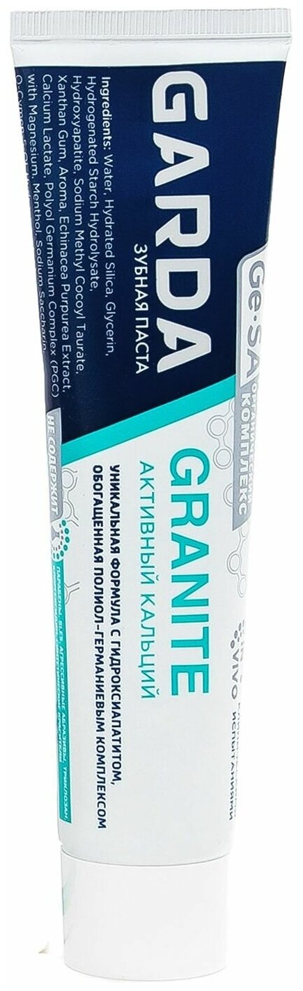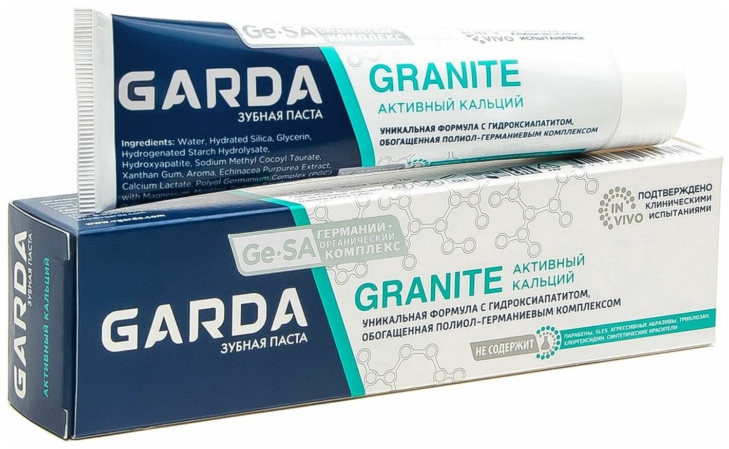 Активная минеральная система зубной пасты GARDA "granite-активный кальций" это уникальная формула с гидроксиапатитом, обогащенная Полиол-Германиевым комплексом (PGC). Лактат кальция и магний способствуют восстановлению, уплотнению и укреплению зубной эмали. Паста бережно и деликатно удаляет мягкие зубные отложения с поверхности эмали, восстанавливая естественную белизну. Эхинацея пурпурная с PGC защищают слизистую оболочку полости рта, оказывая благоприятное воздействие на местный иммунитет. НЕ содержит: парабены, sles, агрессивные абразивы, триклозан, хлоргексидин, синтетические красители.