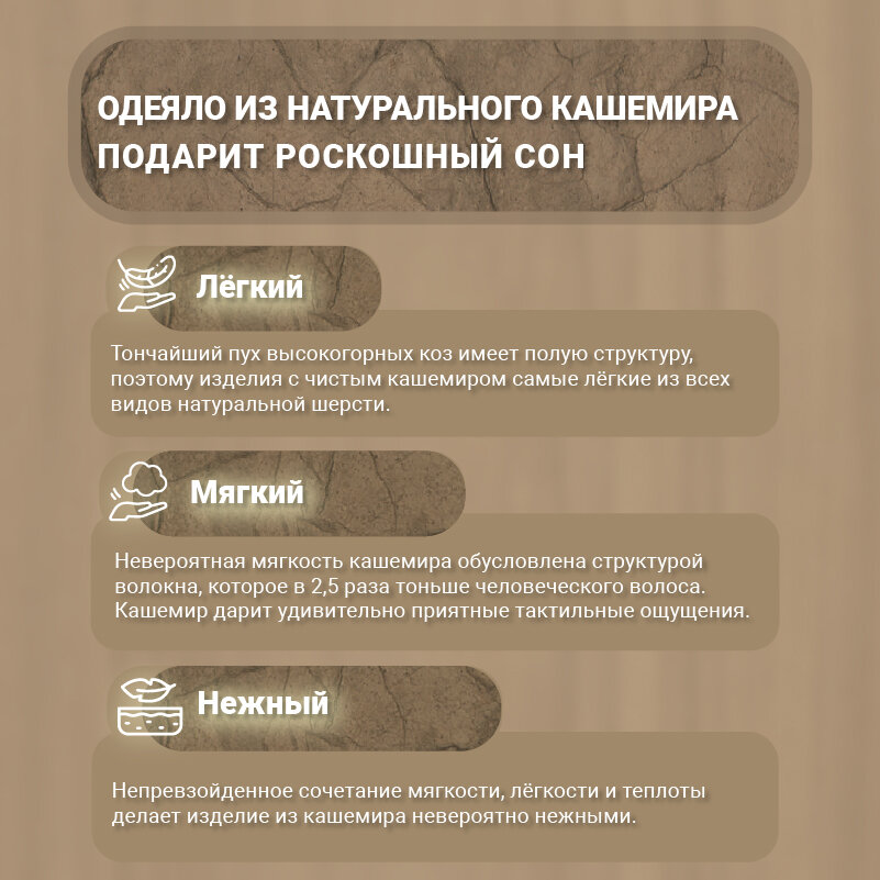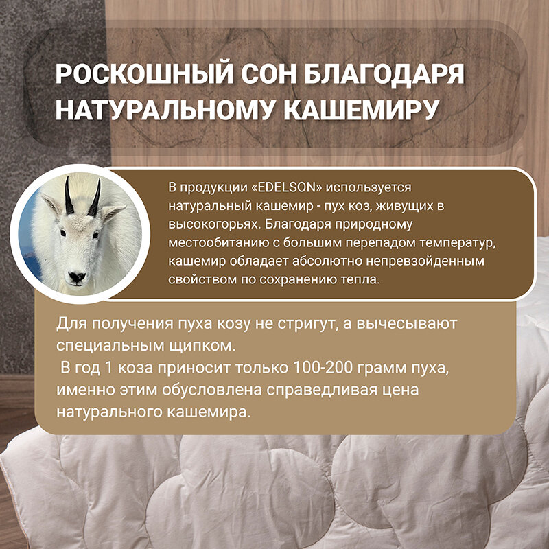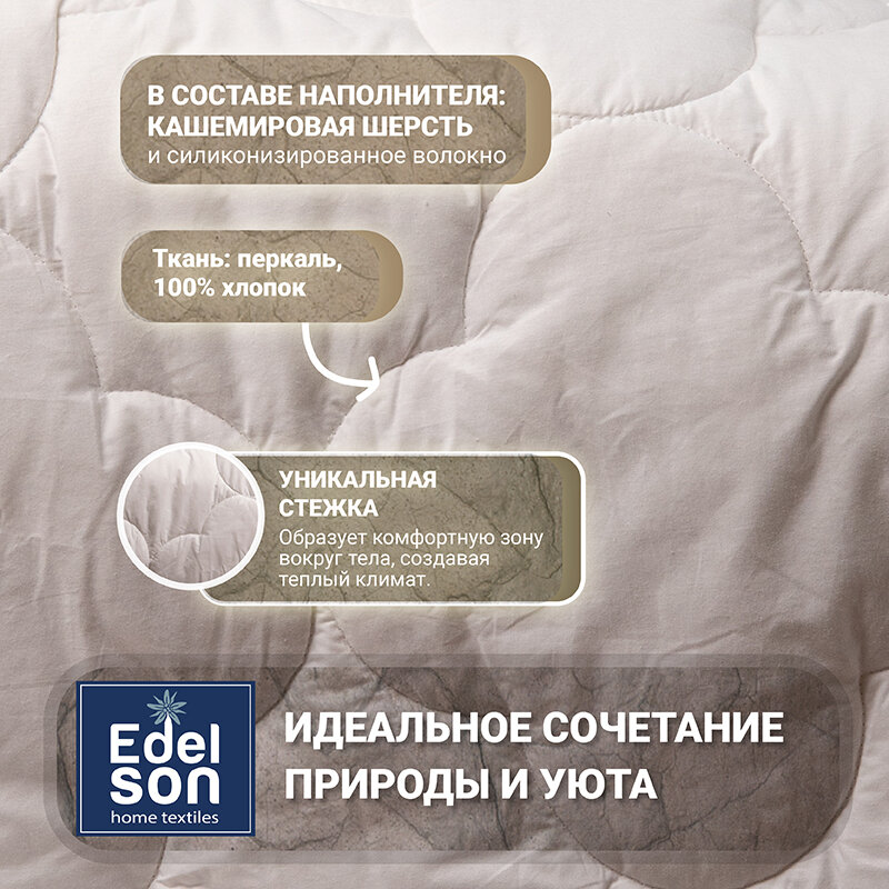 В коллекции «FINE WOOL» представлено всесезонное одеяло с уникальной стежкой. Чехол из высококачественного белого перкаля, 100% хлопок. Наполнитель : кашемировая шерсть (200г/м2) придает одеялу легкость и сухое тепло. Изделия из кашемировой шерсти обладают эффектом сухого тепла, которое благоприятно воздействует на весь организм и успокаивает нервную систему. Невероятная мягкость кашемира обусловлена структурой волокна, которое 2,5 раза тоньше человеческого волоса. Кашемир дарит удивительно приятные тактильные ощущения. Рекомендуем деликатную стирку при 30°. Натуральные материалы в коллекции «FINE WOOL» создают тепло и способствуют расслаблению во время сна.