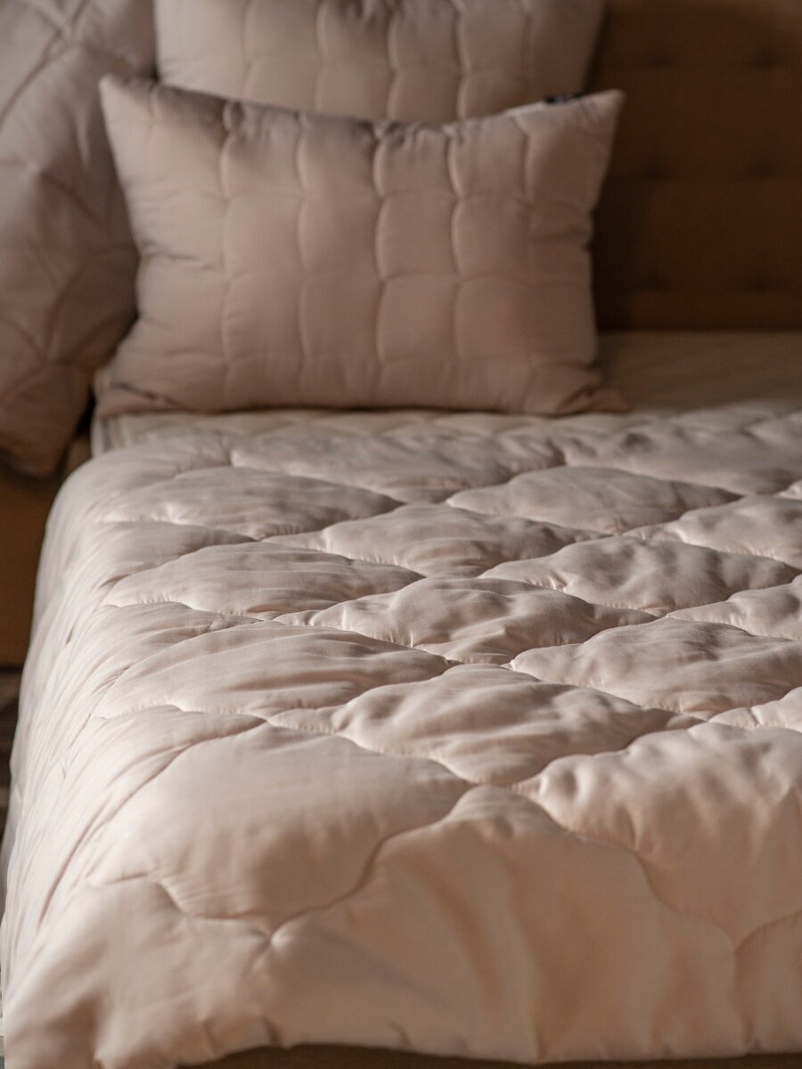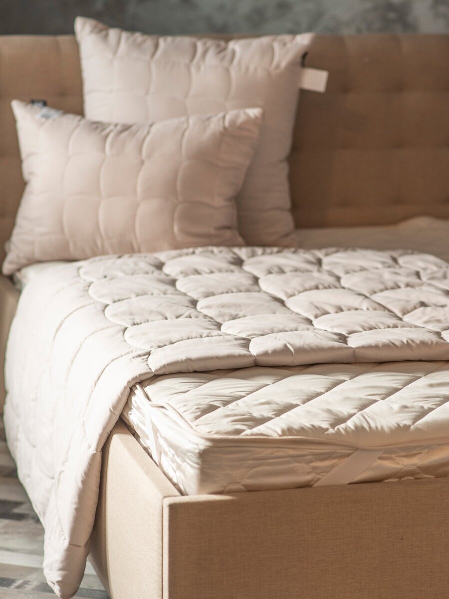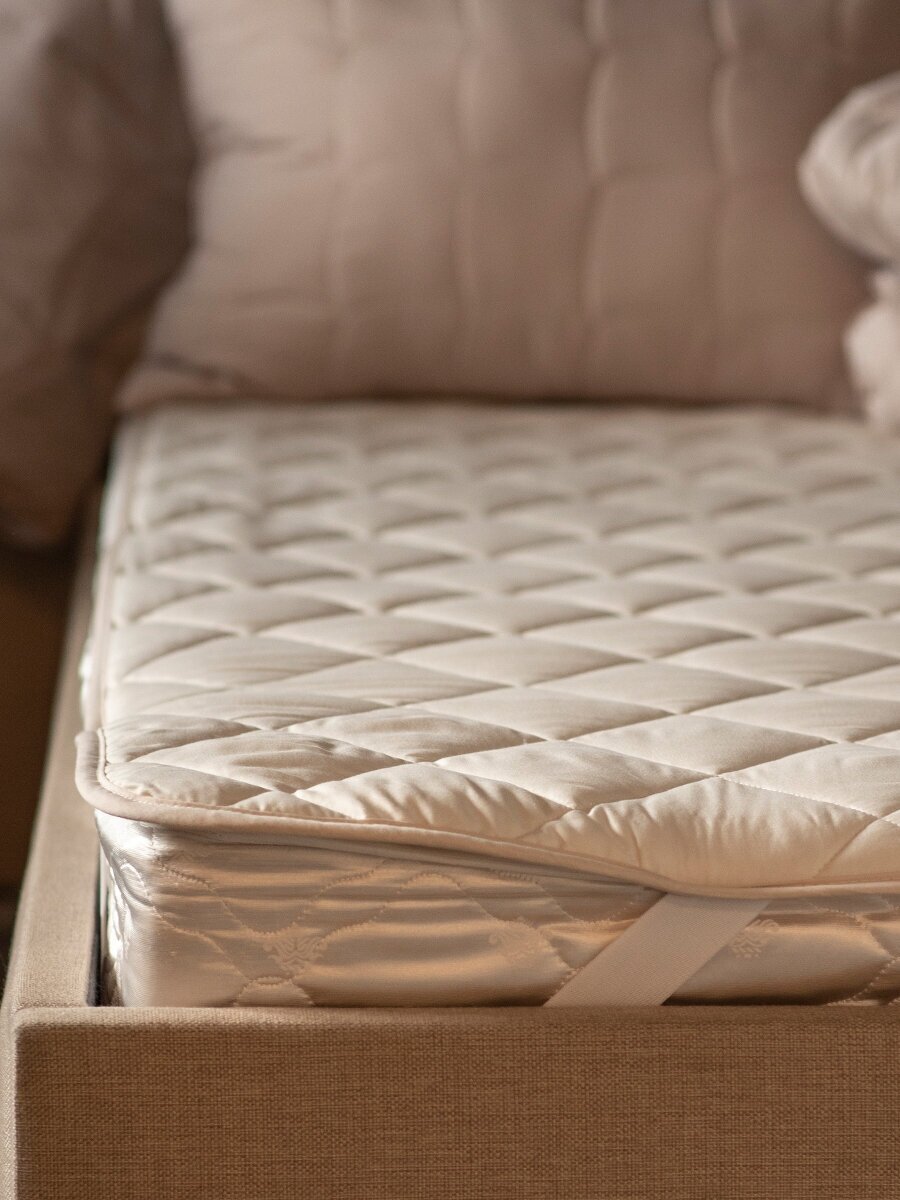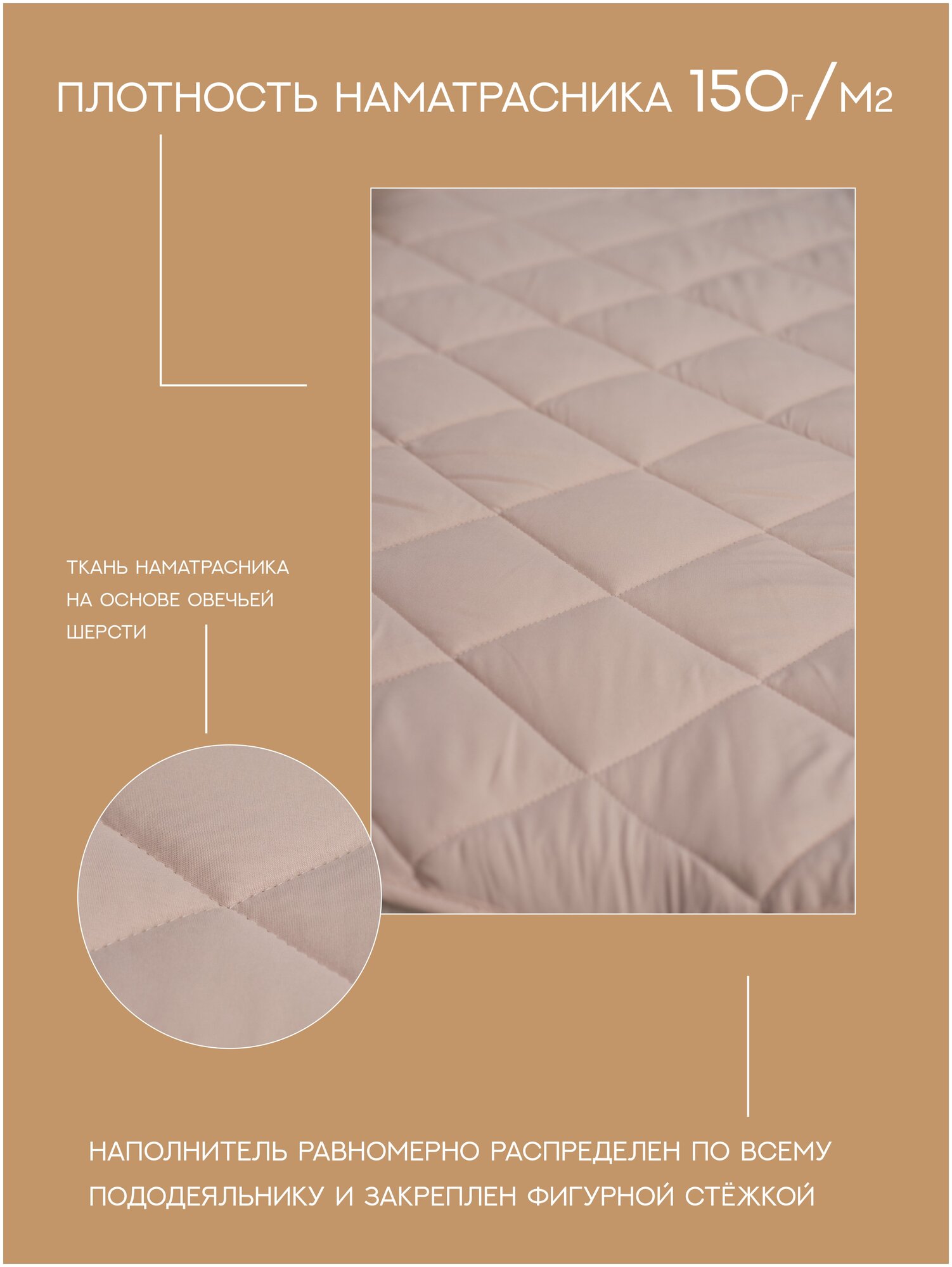 Наматрасник "Овечья шерсть" стеганый, подходит для любого сезона, в чехле из микрофибры с персиковым эффектом, приятного цвета какао с молоком. Наполнитель 150 г/м2 состав: натуральная овечья шерсть 40%, полиэфирное волокно 60%. Благодаря способности пропускать воздух, шерсть обладает эффектом терморегуляции, что поддерживает естественную температуру тела. Успокаивает, благотворно влияет на мышцы.