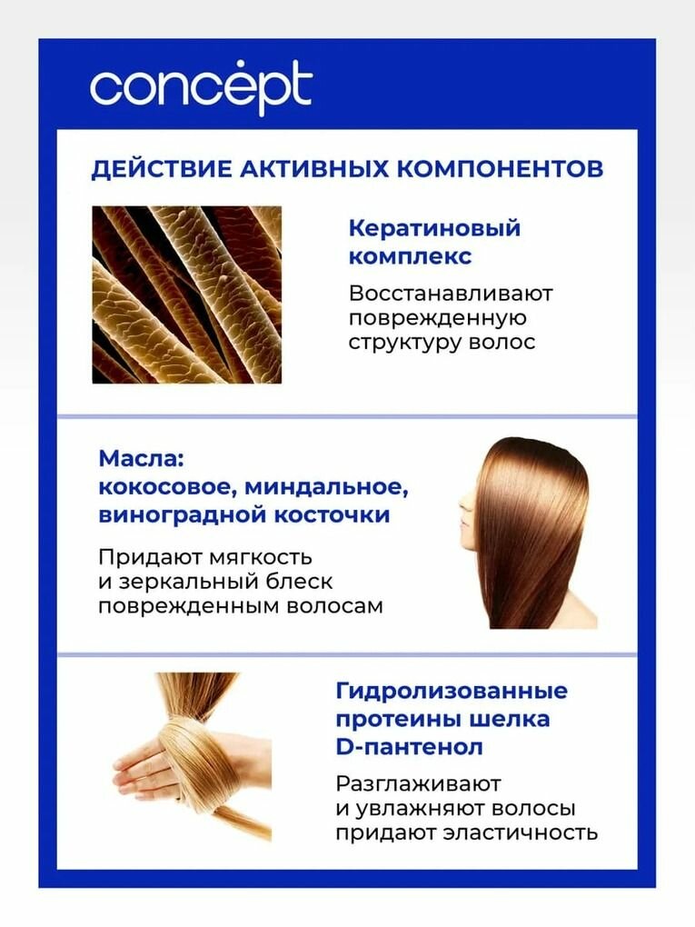 Активные компоненты: Кератиновый комплекс, Масло миндаля, Кокосовое масло, Масло виноградной косточки, Гидролизованные протеины шелка, D-пантенол.