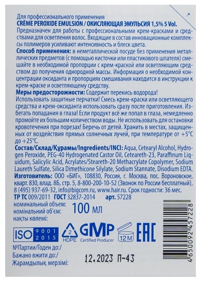 | Состав | Aqua, Hydrogen Peroxide, Cetearyl Alcohol, PEG-40 Hydrogenated Castor Oil, Ceteareth-23, Paraffinum Liquidum, Salicylic Acid, Acrylates/Steareth-20 Methacrylate Copolymer, Sodium Laureth Sulfate, Silica Dimethicone Silylate, Sodium Stannate, Disodium EDTA |