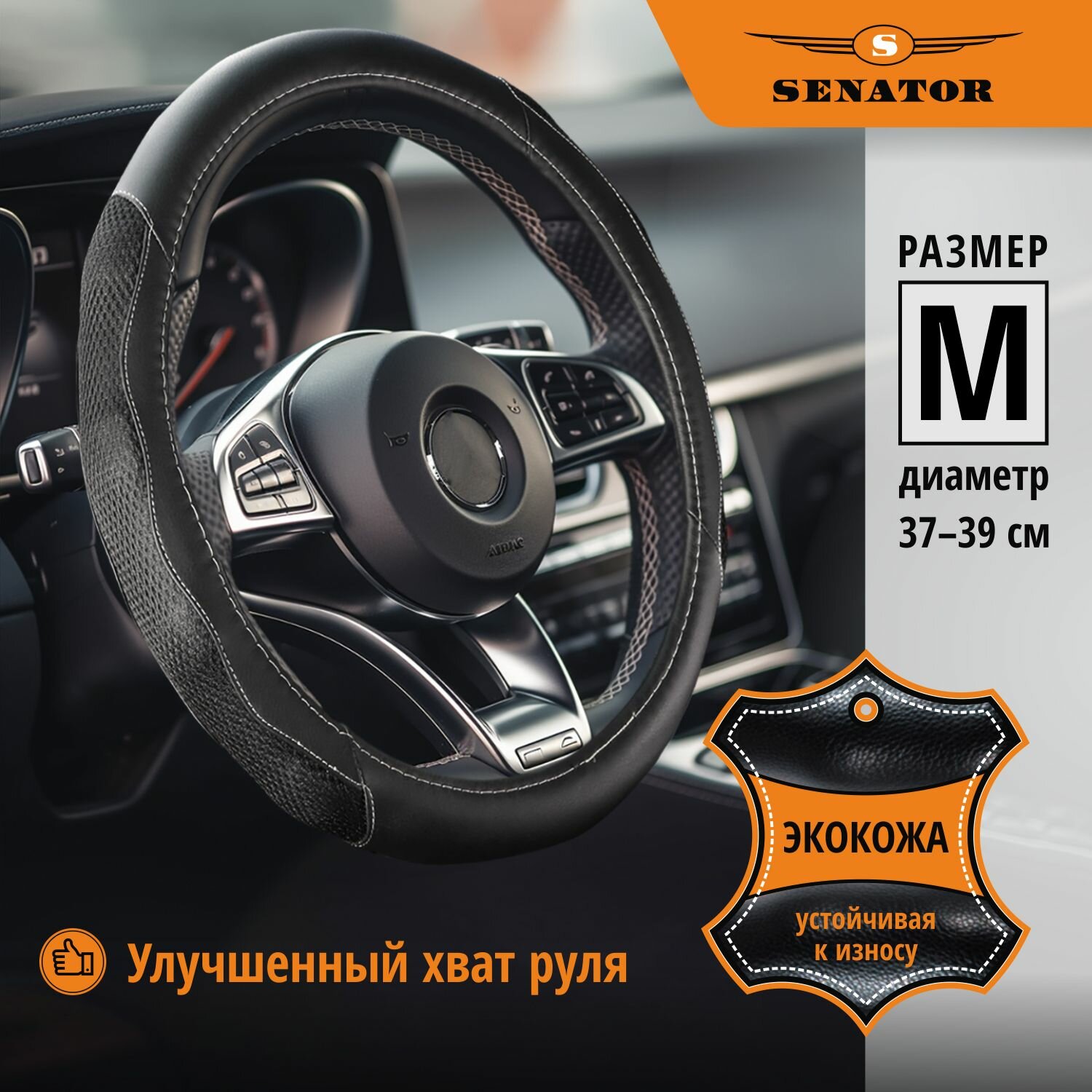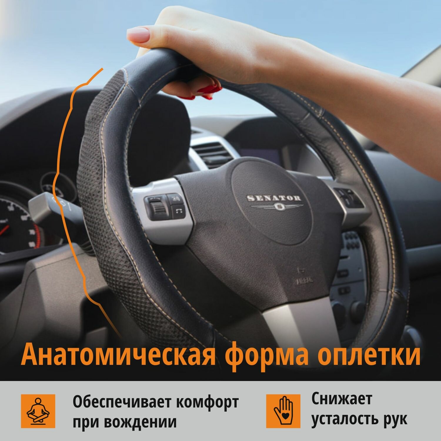 Оплетка на руль Senator "Nebraska" предназначена для рулевых колес с внешним диаметром 37-39 см. Выполнена из автомобильной экокожи на гладком резиновом ободе. Дизайн оплетки дополняют вставки из объемной сетки. Упругие круглые вставки в зоне охвата руля создают дополнительный комфорт во время поездки. Оплетка легко устанавливается на рулевое колесо автомобиля и защищает его от потертостей и загрязнений. Качественная оригинальная рулевая оплетка сделает интерьер автомобиля более выразительным. Диаметр: 38 см.