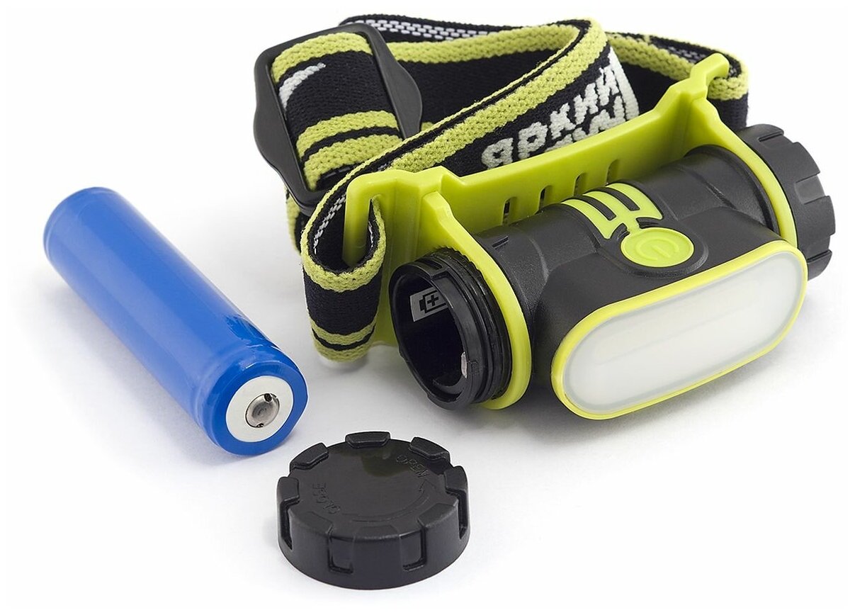 Можно регулировать угол наклона головки фонарика. Удобно крепить на каску или одежду благодаря наличию резинового ремешка.