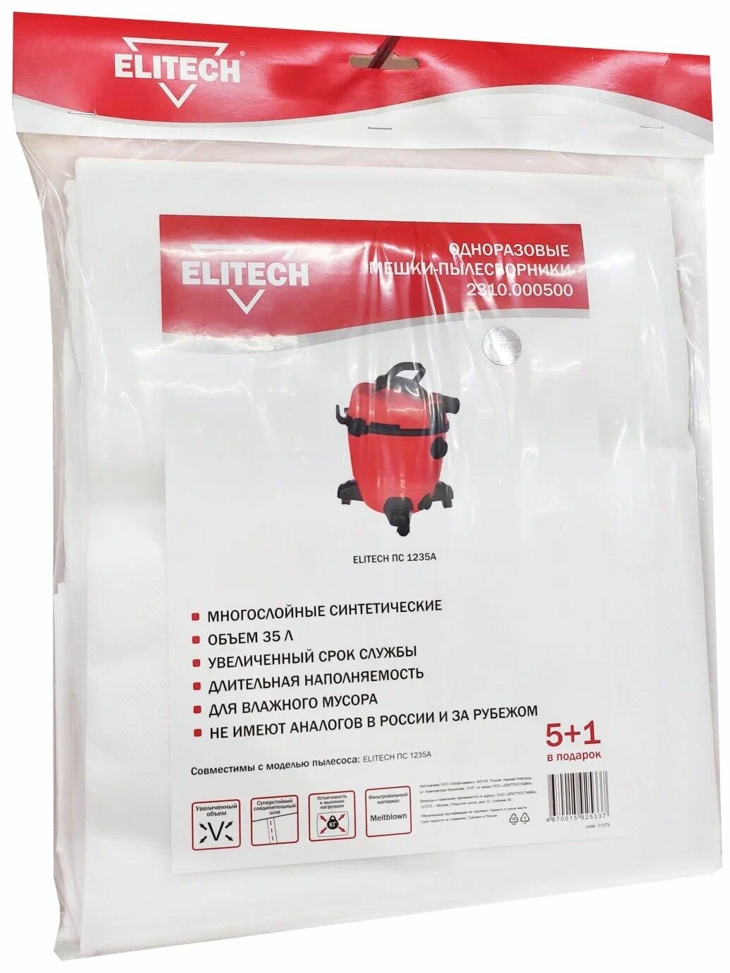Садовый инструмент Elitech 183027 Пылесборник одноразовый, в комплекте 5 шт. Трехслойные синтетические, обладают длительной наполняемостью, могут использоваться для уборки влажного мусора. Не имеет аналогов в России и зарубежом.