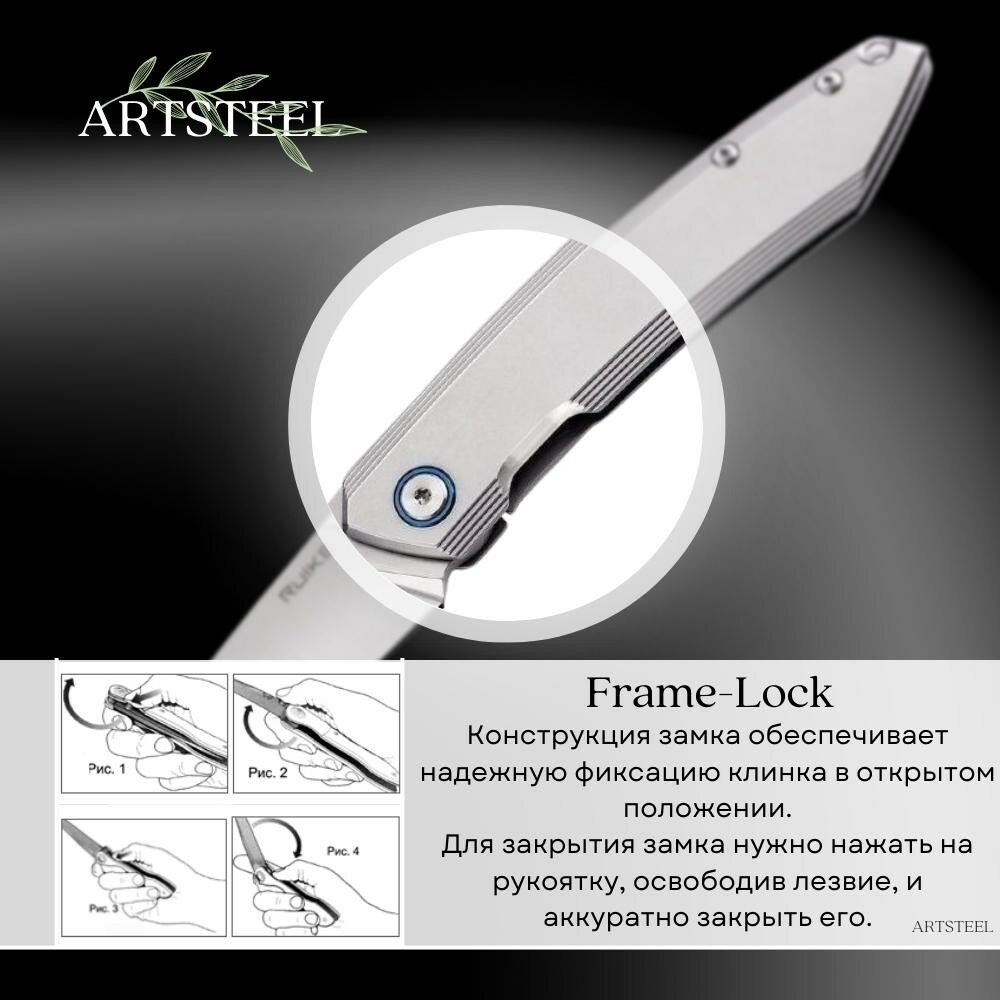 Из металла сделана и рукоять ножа. Для нее использована другая марка стали (3Cr14N) - с еще более выраженной устойчивостью к ржавлению. А отшлифована ручка ножа тем же способом, что и его лезвие. Чтобы использовать этот складной нож было в любых обстоятельствах безопасно, в него встроен надежный замок, определяющий положение относительно рукояти клинка. Его название - Frame lock. Данный замок - линейного типа, запирающая пластина, которая фиксирует клинок, одновременно является и одним из элементов рукояти. А дополнительным блокиратором на случаи особо высоких нагрузок на клинок является механизм "Beta Plus" Safety Lock. Помимо того, что нож Ruike является удобным и надежным, он еще и достаточно легкий (весит всего 93 г), а потому его комфортно носить с собой повсюду.