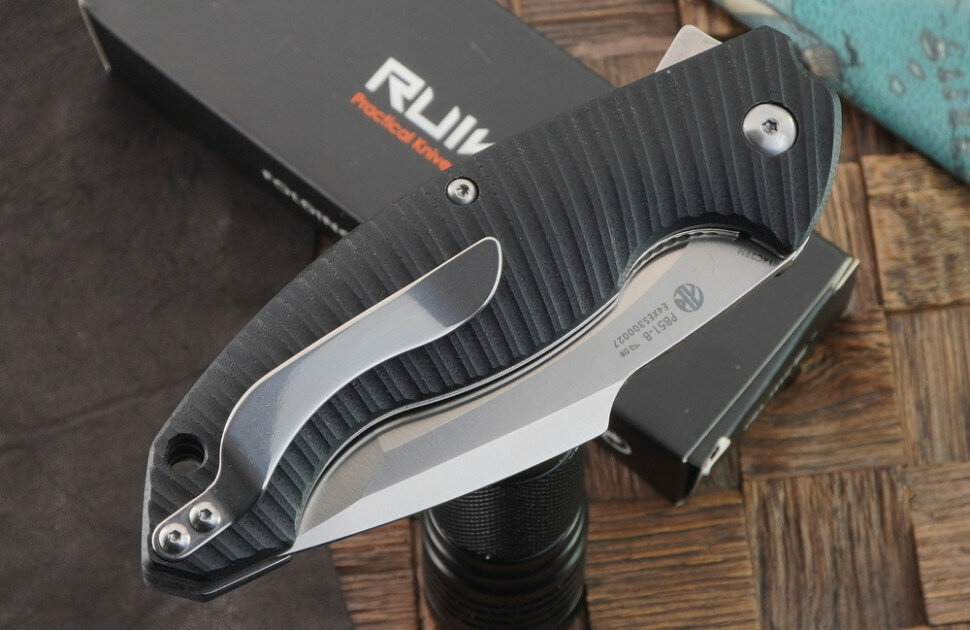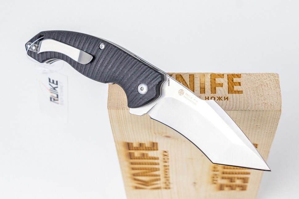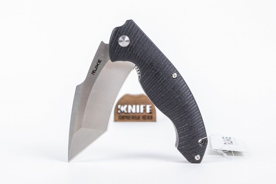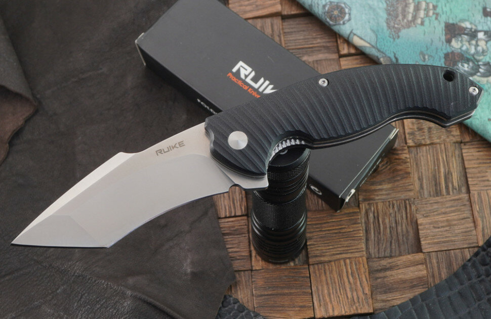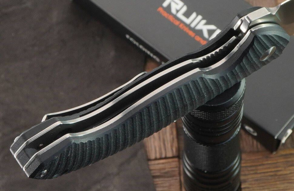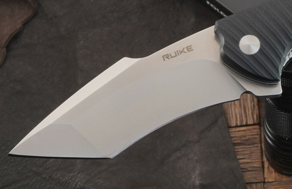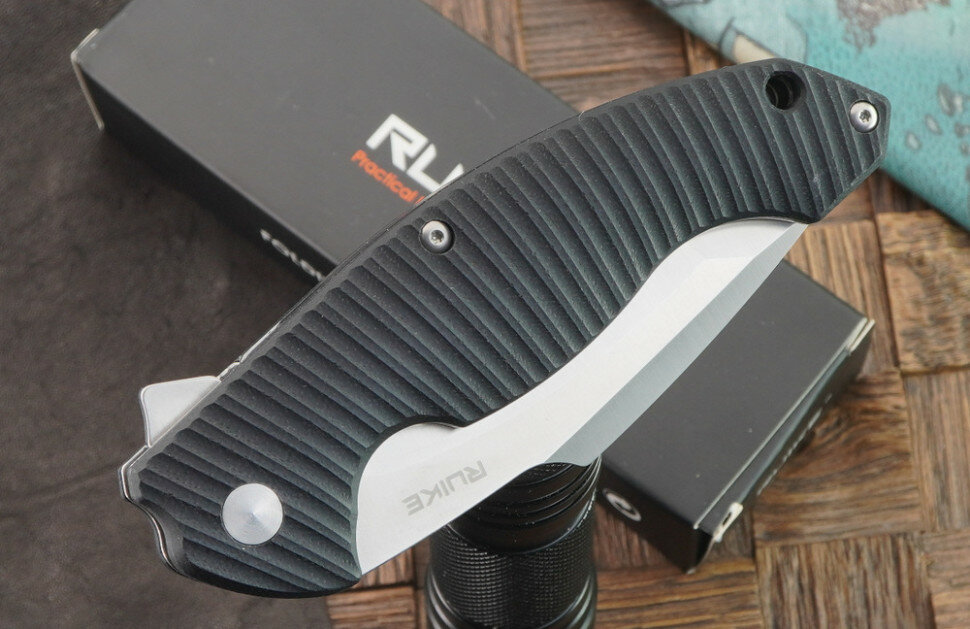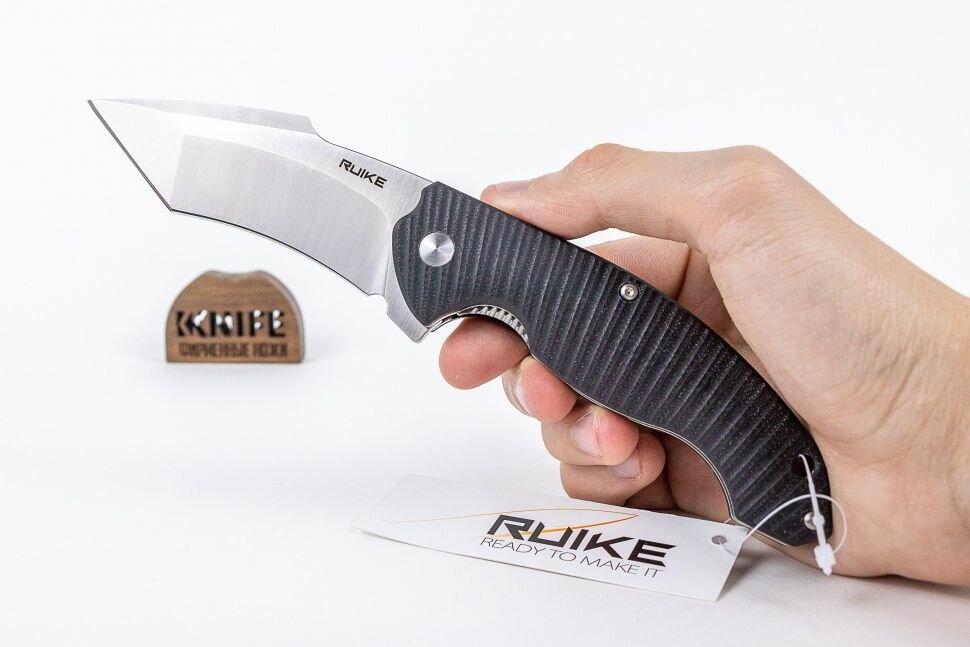 Лезвие ножа Ruike одинаково хорошо справляется с прокалыванием и нарезанием. Модель имеет удобную рукоятку изогнутой формы, адаптированную под частое использование. Удерживать нож весьма комфортно.