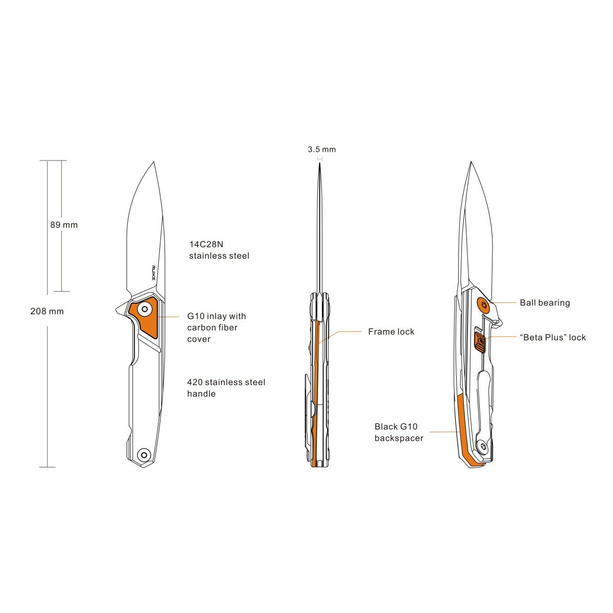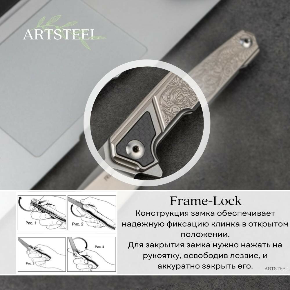 Этот нож предназначен для тех, кто в восторге от варианта Ruike M875-TZ, но при этом отдают предпочтение лезвию из стали 14C28N и ручке из сплава 420. Эффектная модель, на рукоятке которой есть гравировка в виде орнамента с жимолостью. Жимолость по традиции считается символом добрых пожеланий. В ноже есть защитный механизм BetaPlus, который предотвращает случайное закрытие клинка. Компактная модель пригодится туристам, путешественникам, и вполне подходит для ежедневного ношения. Очень удобный, легкий, красивый нож. Форма лезвия - drop point. Такой тип одинаково эффективен и при нарезании, и при накалывании. Часто клинками формы drop point обладают ножи, которые активно применяются туристами. Длина ножа достигает 20,8 см, а длина клинка составляет 8,9 см. Толщина лезвия - 3,5 мм.