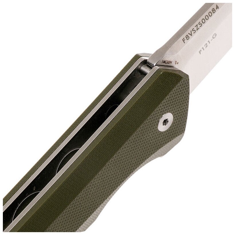 У основания клинка присутствует небольшой "плавник", с помощью которого нож и открывается. В открытом положении он становится в начале рукояти, играя роль гарды. Благодаря наличию специальных шарниров, клинок ножа плавно и достаточно быстро выдвигается из рукояти. В рабочем положении он фиксируется с помощью замка Liner-lock. Рукоятка ножа состоит из стальных лайнеров и накладок из G10. Накладки могут иметь черный () или зеленый (P121-G) цвет.