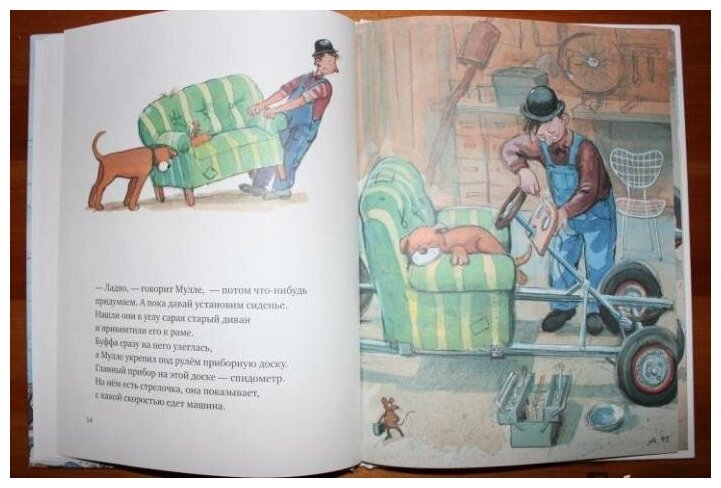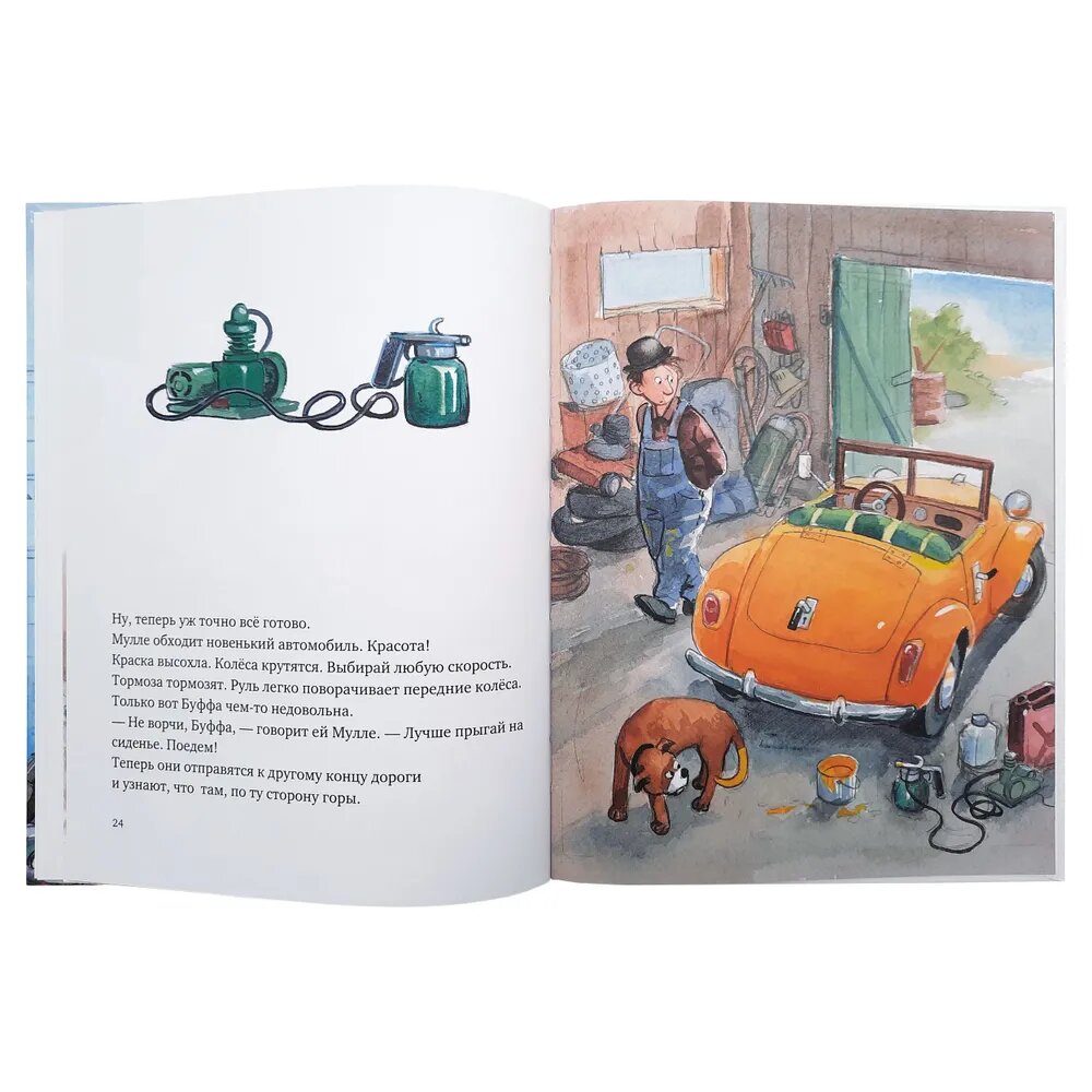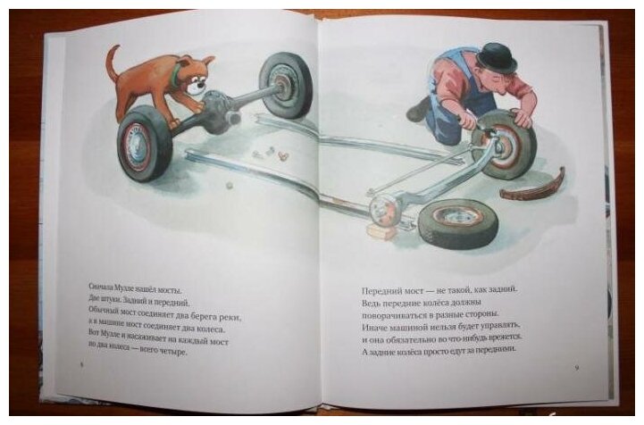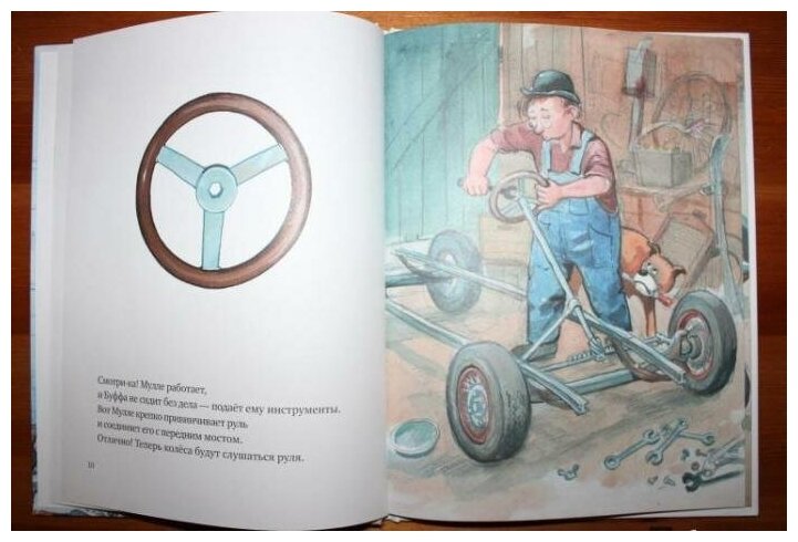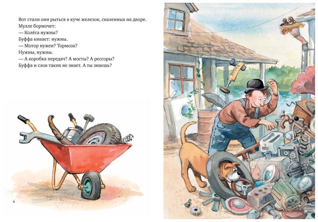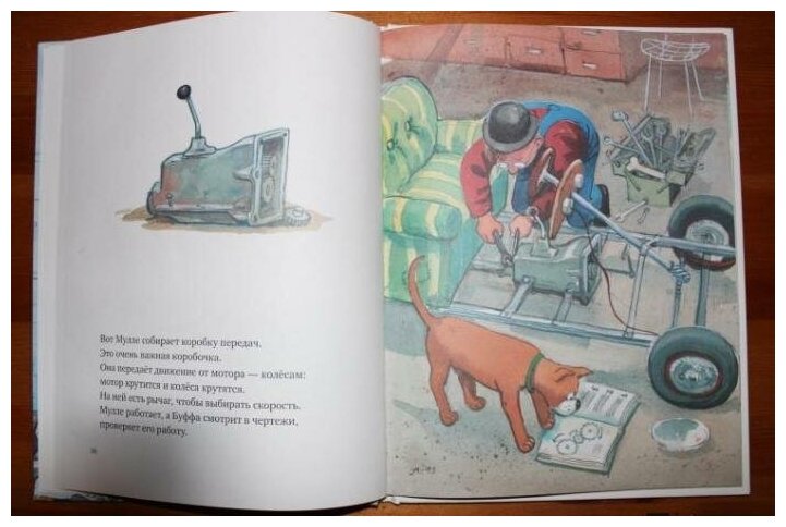 Эту книгу купили самой первой из серии книг про Мулле Мека и собачку Буфу. В книге рассказывается и показывается, как был собран автомобиль. Сын с трёх до четырех лет был просто увлечён, все слушал внимательно, показывал. Мне кажется для мальчиков это очень интересный вариант литературы.