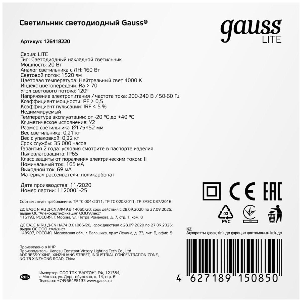 Светильник Gauss Lite круглый LED 20W 1520lm 4000K 175х52 мм