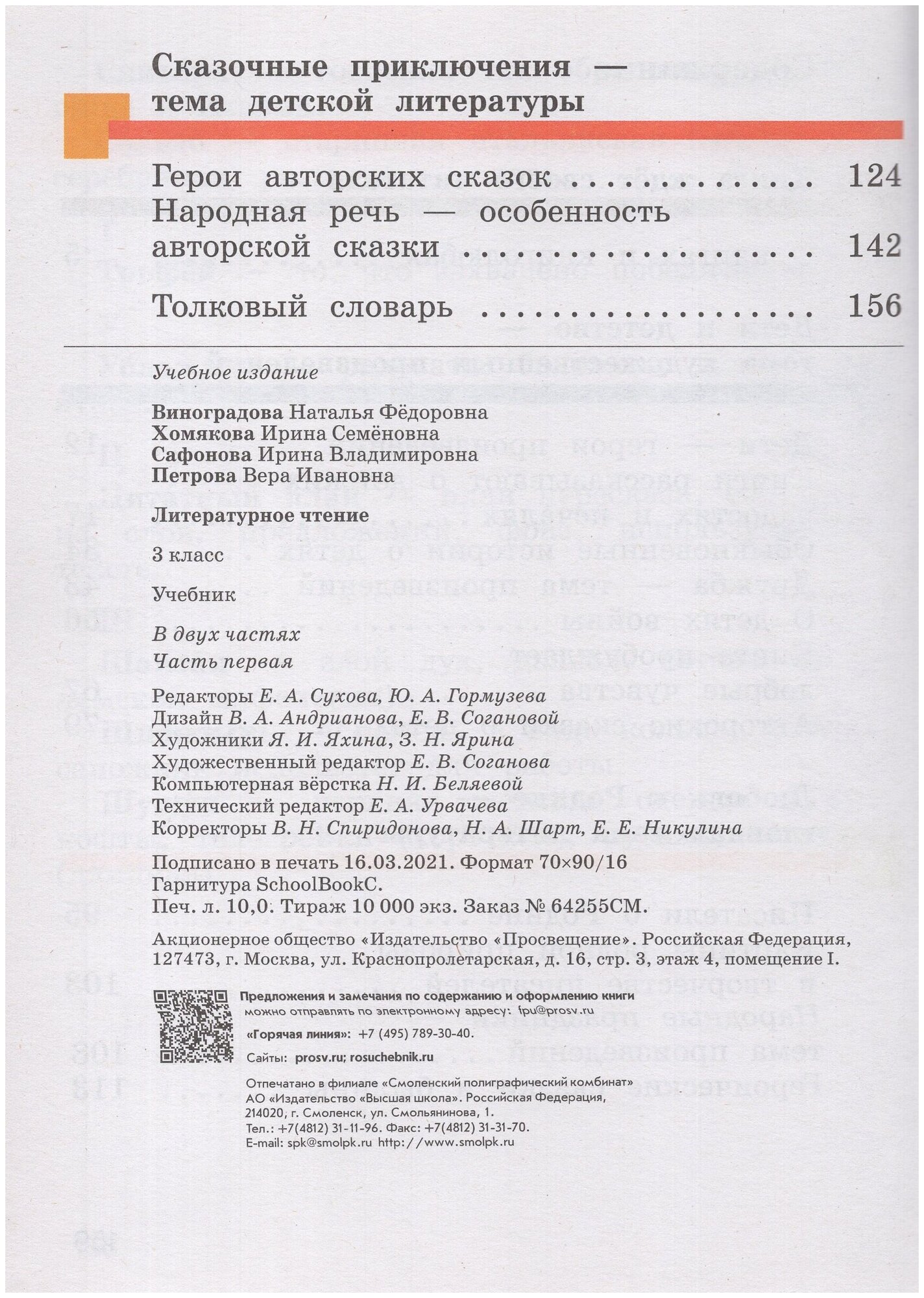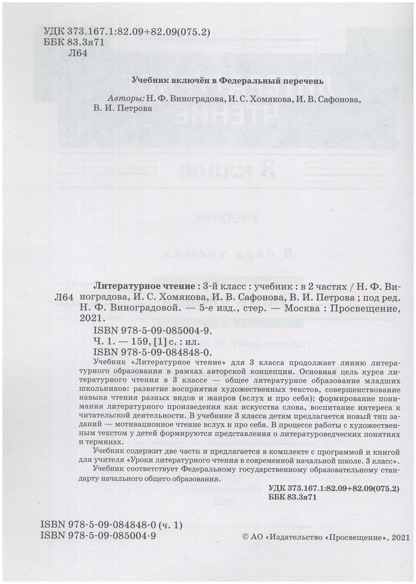 Литературное чтение 3 класс Учебник для учащихся общеобразовательных организаций В двух частях Часть первая (Виноградова Наталья Федоровна, Хомякова Ирина Семеновна, Сафонова Ирина Владимировна); Вентана-Граф, 2021