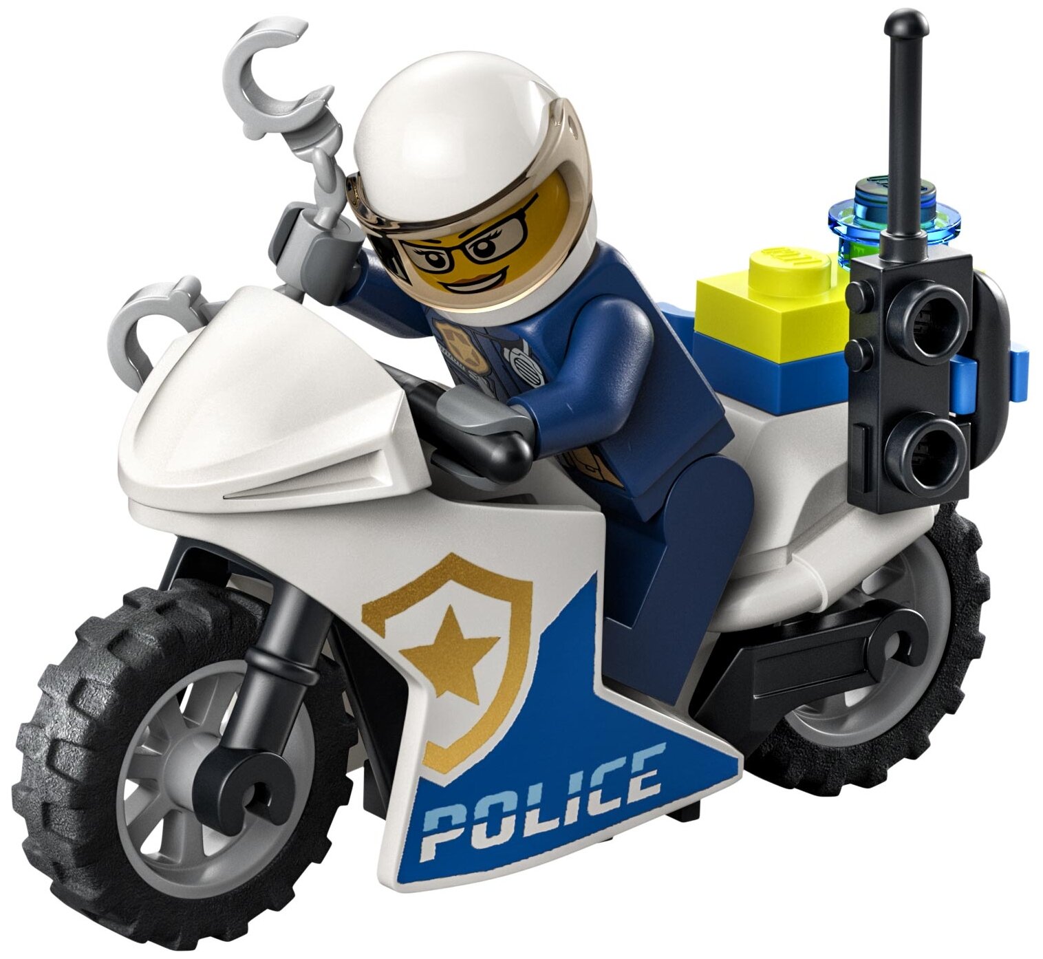 В этот набор из 295 предметов входят дрон, полицейский мотоцикл, автомобиль мошенников, место пожара, светофор, фигурка кошки и 3 минифигурки.