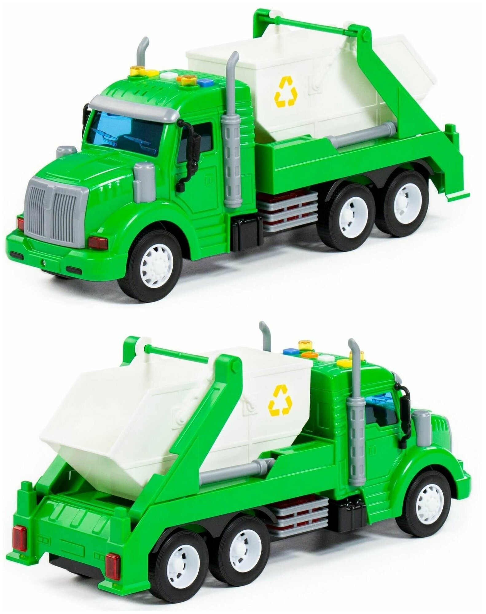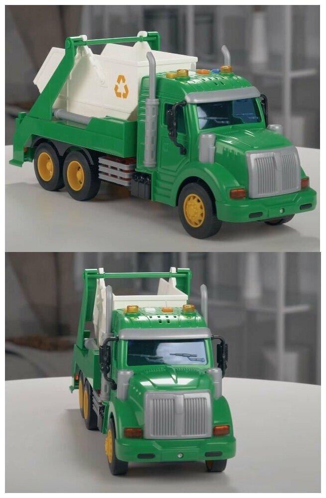 Спецмашина имеет три пары колёс на железных осях, кроме того, она оснащена съёмным контейнером, который позволит придумывать различные сценарии игры. На кабине авто имеется 4 кнопки управления звуковыми и световыми эффектами.