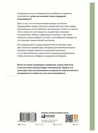 Книга Филиппа Котлера — квинтэссенция знаний по стратегическому менеджменту. Это то, что вам действительно нужно знать, чтобы выжить в условиях жесткой конкуренции. Ключевые идеи каждой рассматриваемой теории проиллюстрированы многочисленными примерами из разных сфер бизнеса, как вымышленными, так и из реальной жизни.