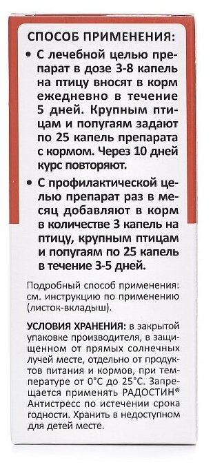 Препарат в дозе 3-8 капель на птицу вносят ежедневно в корм в течение 5 дней. Крупным птицам и попугаям задают по 25 капель препарата с кормом. Через 10 дней курс повторяют. С профилактической целью 1 раз в месяц препарат добавляют в корм в количестве 3 капли на птицу (крупным – 25 капель) в течение 3-5 дней.