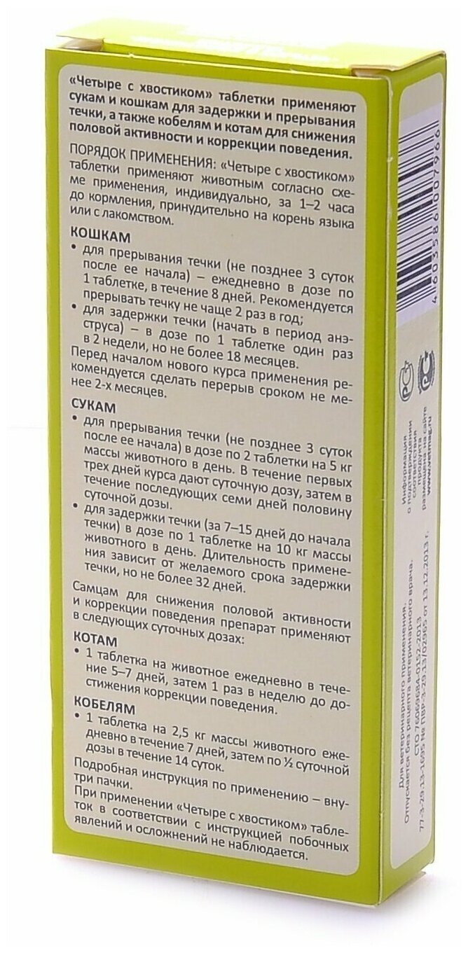 Препарат для регуляции половой охоты у кошек и собак Четыре с хвостиком 20шт ООО НВЦ Агроветзащита С.-П. (1473122)