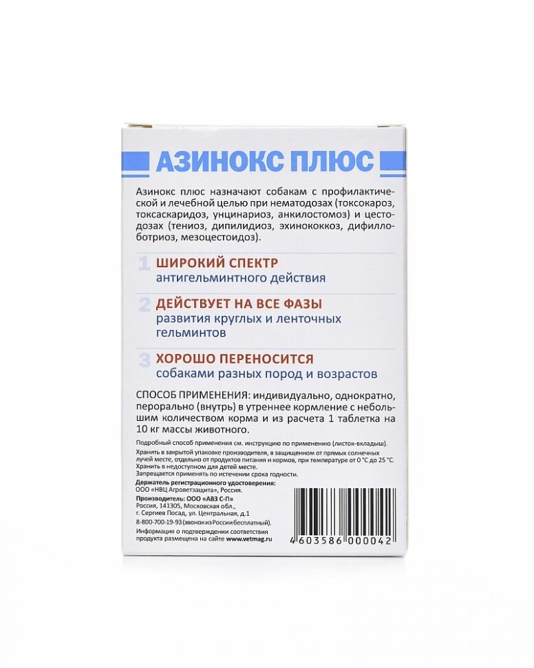 Азинокс плюс обладает широким спектром антигельминтного действия на все стадии развития круглых и ленточных гельминтов, в том числе Toxocara canis, Toxascaris leonina, Uncinaria stenocephala, Ancylostoma caninum, Trichocephalus vulpis, Echinococcus granulosus, Echinococcus multilocularis, Dipylidium caninum, Taenia spp., Multiceps multiceps, Mesocestoides spp.