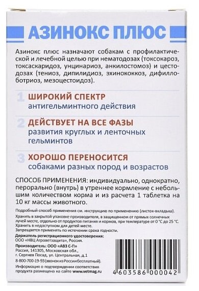 Сервис сравнения цен СкидкаГИД предлагает сравнить цены на товар «Азинокс плюс для собак антигельминтик против ленточных гельминтов 1таб./10кг 3шт ООО НВЦ Агроветзащита С.-П. (1473122)»