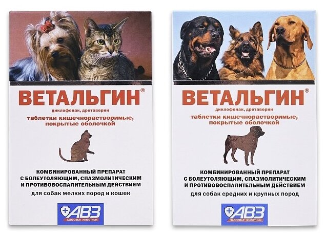 Ветальгин назначают собакам и кошкам самостоятельно или в комплексной терапии при воспалительных дегенеративных заболеваниях суставов и позвоночника (ревматоидном артрите, артрозах, остеоартритах, спондилоартрозах), невралгиях, невритах, бурситах, синовитах, тенденитах, тендосиновитах, ушибах, растяжении связок, мышц и сухожилий, воспалительных отеках мягких тканей, посттравматических и послеоперационных болевых синдромах, спазмах гладкой мускулатуры при заболеваниях мочевыводящей системы и желудочно-кишечного тракта.
