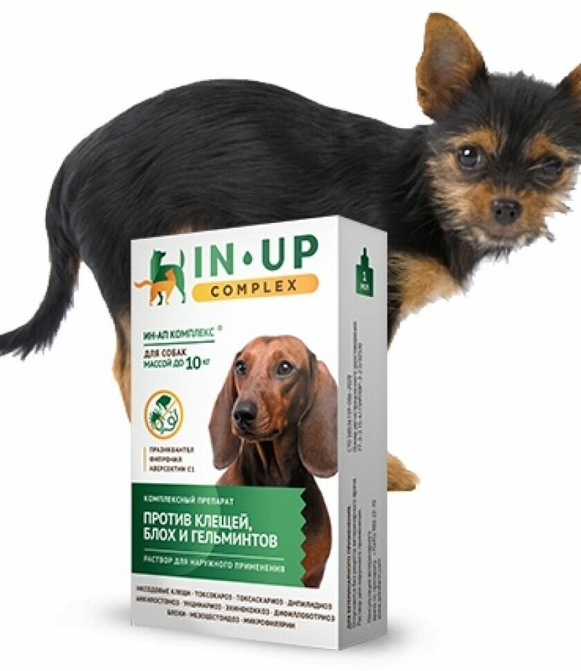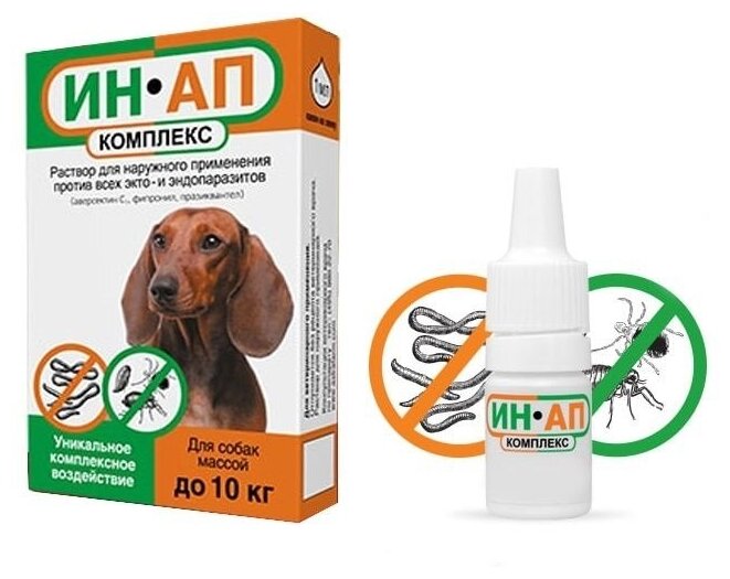 Капли ИН-АП комплекс для собак до 10 кг – лечебно-профилактическое антипаразитарное средство, обладающее комплексным действием против личиночных и половозрелых фаз развития эктопаразитов (блох, иксодовых клещей, вшей, власоедов) и эндопаразитов (круглых и ленточных глистов), паразитирующих у собак и щенков. ИН-АП комплекс выпускается в форме раствора для наружного применения. Рекомендуется регулярно проводить дегельминтизацию собаки.