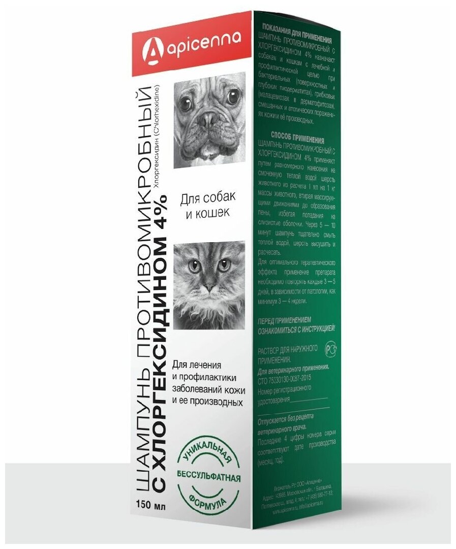 Шампунь противомикробный с хлоргексидином 4% назначают собакам и кошкам с лечебной и профилактической целью при бактериальных (поверхностных и глубоких пиодерматитах), грибковых (малацезиозах и дерматофитозах), смешанных и атопических поражениях кожи и её производных.