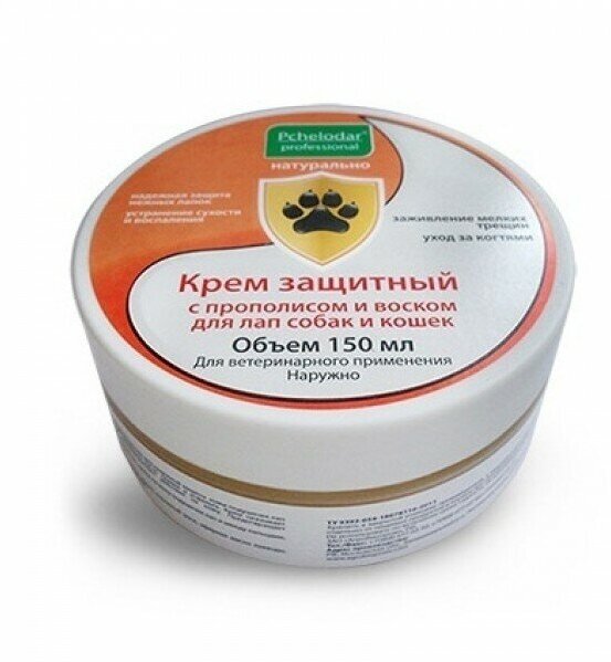 Защитный крем Пчелодар для лап животных - инновационное средство для защиты лап животных во время прогулки от неблагоприятного воздействия противогололедных химических реагентов и низких температур, для предотвращения травмирования кожи подушечек лап снежным настом, гравием или асфальтом.