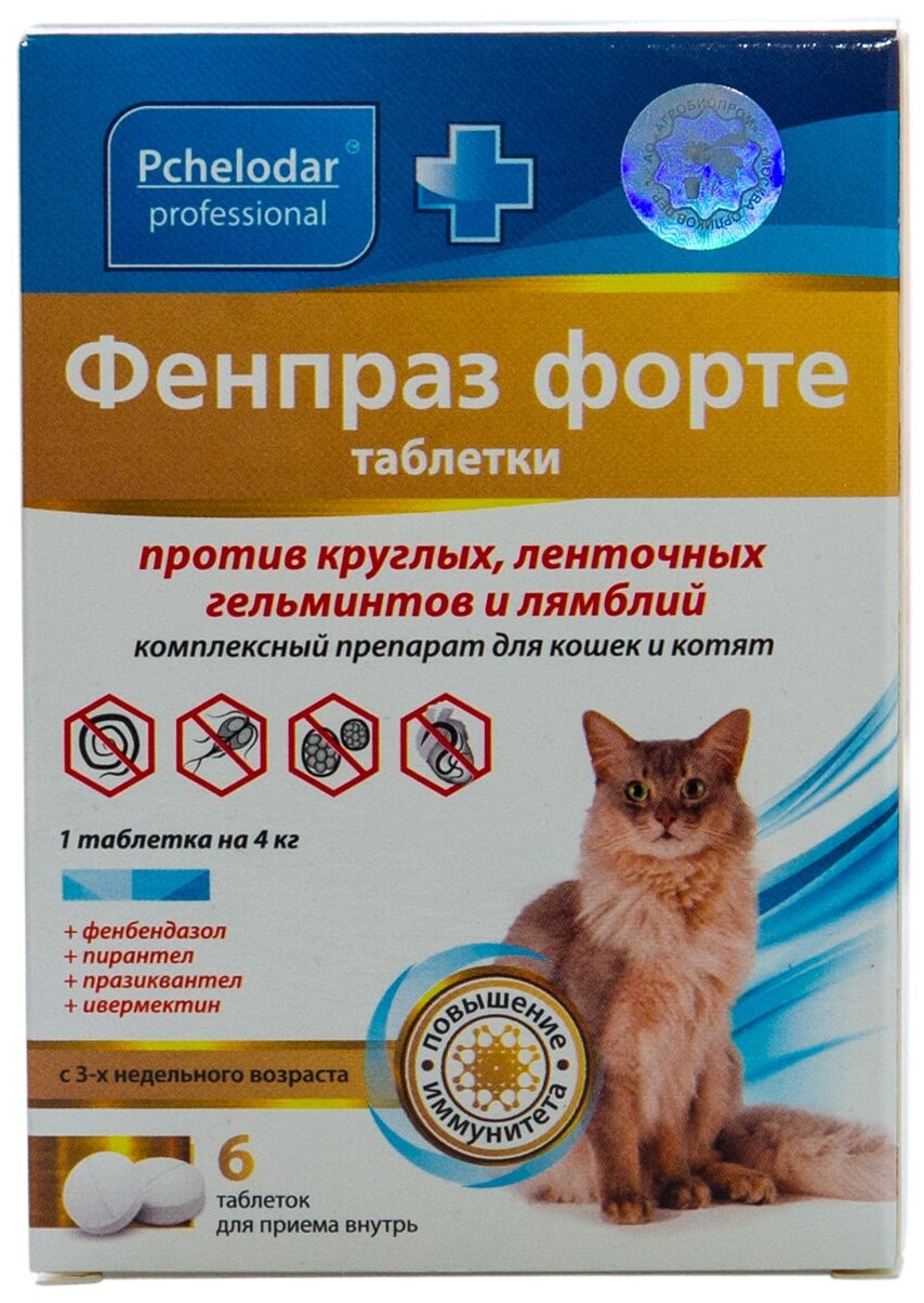 Фенпраз – универсальный антигельминтик против цестодозов и нематодозов кошек. Фенпраз обладает широким спектром антигельминтного действия на все стадии развития круглых и ленточных червей. Входящее в состав пчелиное маточное молочко оказывает гепатопротекторное действие, улучшая работу печени, и тем самым защищает ее от влияния неблагоприятных факторов.