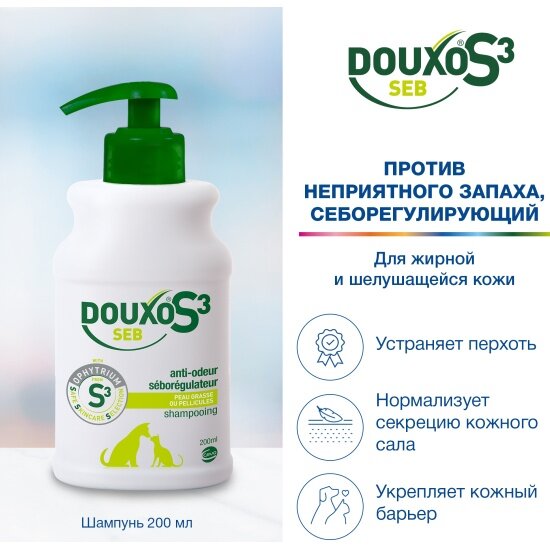 Зоогигиеническое моющее средство для собак и кошек.Без мыла, сульфатов, парабенов, красителей, наночастиц.Содержит гипоаллергенную и рН-сбалансированную парфюмерную композицию. Офитриум (Ophytrium), очищенный компонент натурального происхождения, действующий в трех направлениях S3 (Safe Skincare Selection) - безопасный выбор по уходу за кожей:укрепляет механический кожный барьер для упругости и длительного увлажнения кожи;нормализует естественную микрофлору кожи;успокаивает раздражённую кожу. Применение: шампунь предназначен для применения собакам и кошкам с жирной кожей склонной к образованию перхоти. Уменьшает образование перхоти, избыток кожного сала и неприятные запахи, увлажняет и нормализует микрофлору кожи, облегчает распутывание шерсти, делает шерсть мягкой и блестящей. Для достижения лучшего эффекта Дуксо® S3 Себ шампунь рекомендуется применять попеременно с Дуксо® S3 Себ муссом. Способ применения: нанести необходимое количество шампуня на хорошо увлажненную теплой водой шерсть животного. Массажными движениями тщательно вспенить и равномерно распределить пену по шерсти, избегая попадания в глаза. Через 5-10 минут шампунь тщательно смыть чистой водой. Повторить при необходимости. После окончания процедуры шерсть животного высушить и расчесать. Одно нажатие на дозатор рассчитано на 2 кг массы животного, для длинношерстных пород и животных с густой шерстью может потребоваться двойное количество шампуня. Меры предосторожности: вызывает сильное раздражение глаз. Хранить в недоступном для детей и домашних животных месте! При попадании шампуня в глаза рекомендуется тщательно промыть их проточной водой в течение нескольких минут. При стойком раздражении глаз обратиться к врачу (при себе иметь этикетку). Только для наружного применения! Состав INCI Условия хранения: хранить в закрытой упаковке производителя, в защищенном от прямых солнечных лучей месте, отдельно от пищевых продуктов и кормов, при температуре от 2оС до 25оС. Объем: 200 мл