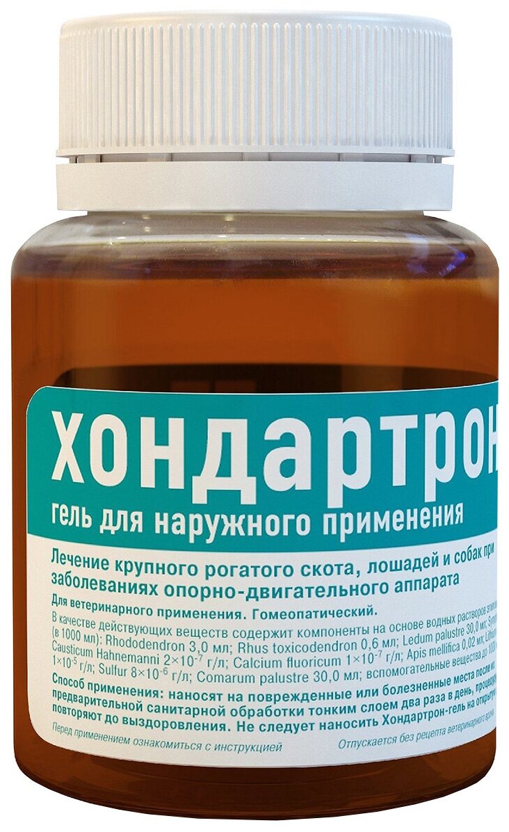 Хондартрон-гель — комплексное гомеопатическое лекарственное средство при заболеваниях опорно-двигательного аппарата, в том числе ревматоидного происхождения у животных. Гель обладает противовоспалительным, обезболивающим, хондропротекторным действием. Входящие в состав Хондартрон-геля гомеопатические компоненты, избирательно воздействуют на фиброзные ткани (сухожилия, связки, фасции), уменьшая застойные явления в них, уменьшают отечность, способствуют исчезновению боли, восстанавливают обмен веществ в пораженном суставе, улучшают его питание и кровоснабжение, предотвращают разрушение хряща и деформацию сустава. По степени воздействия на организм теплокровных животных Хондартрон-гель относится к малоопасным веществам и не оказывает местнораздражающего и сенсибилизирующего действия.