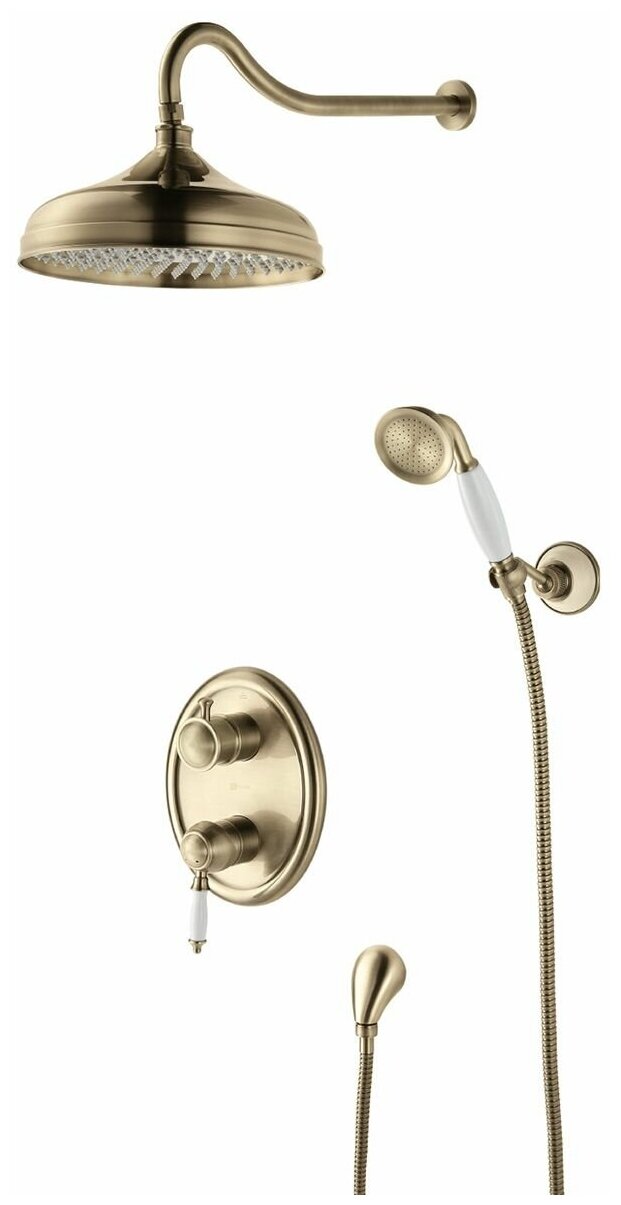 | Оснащение | Душевая лейка / Шланг для душа / Держатель душа / Кронштейн для верхнего душа / Шланговое подключение / Скрытая монтажная часть / Верхний душ / Смеситель |