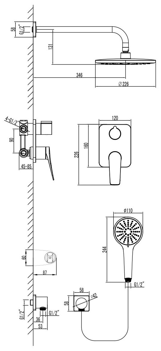 | Состав комплекта | верхний душ, настенный держатель, смеситель, шланговое подключение, душевой гарнитур |