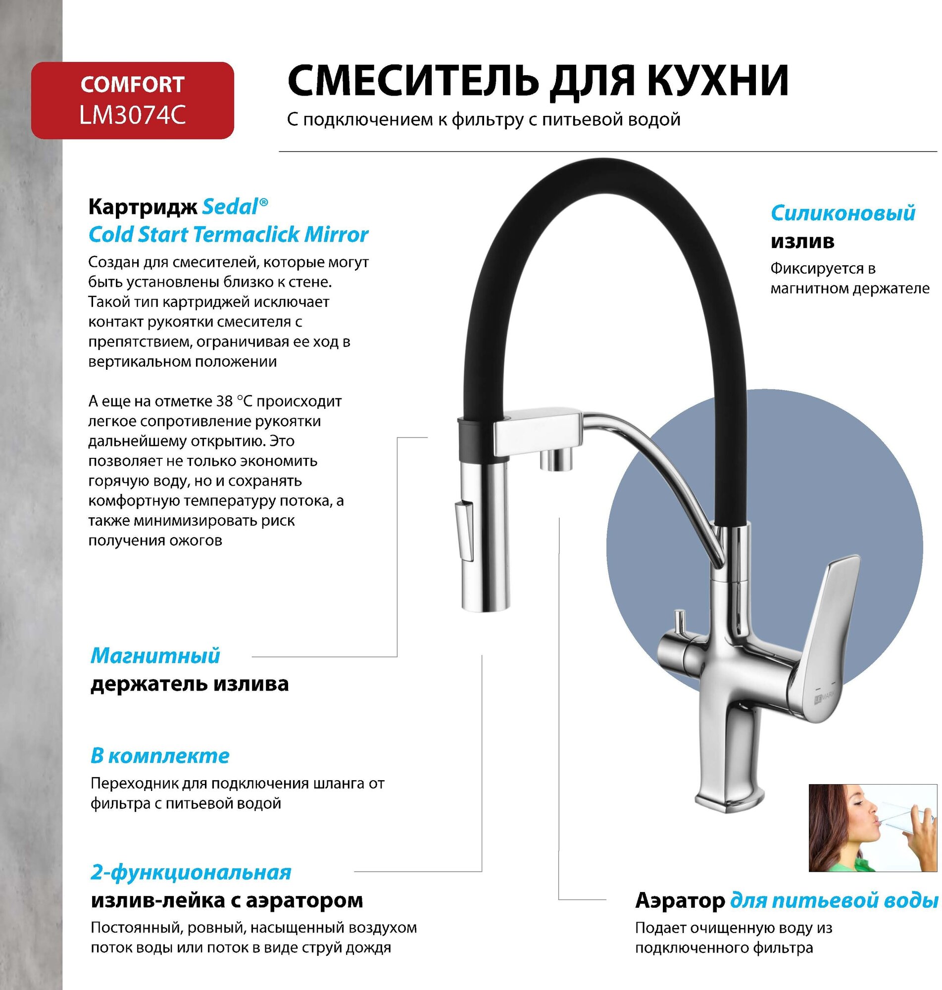 | Дополнительные функции | вращение излива, подключение фильтра |