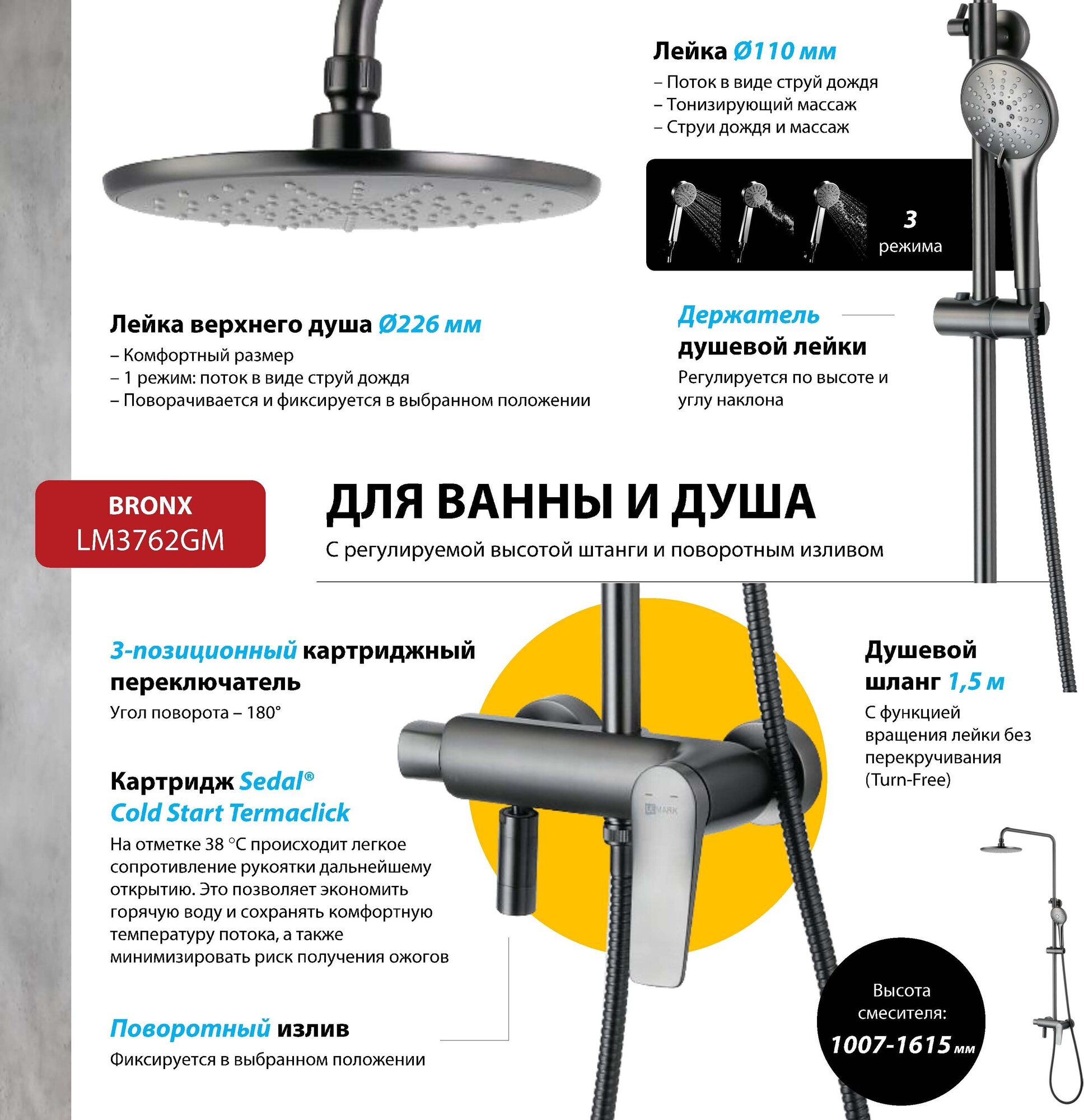 Душевая система Lemark Bronx LM3762GM - идеально подходит для ванной комнаты, выполненной в современном стиле.
