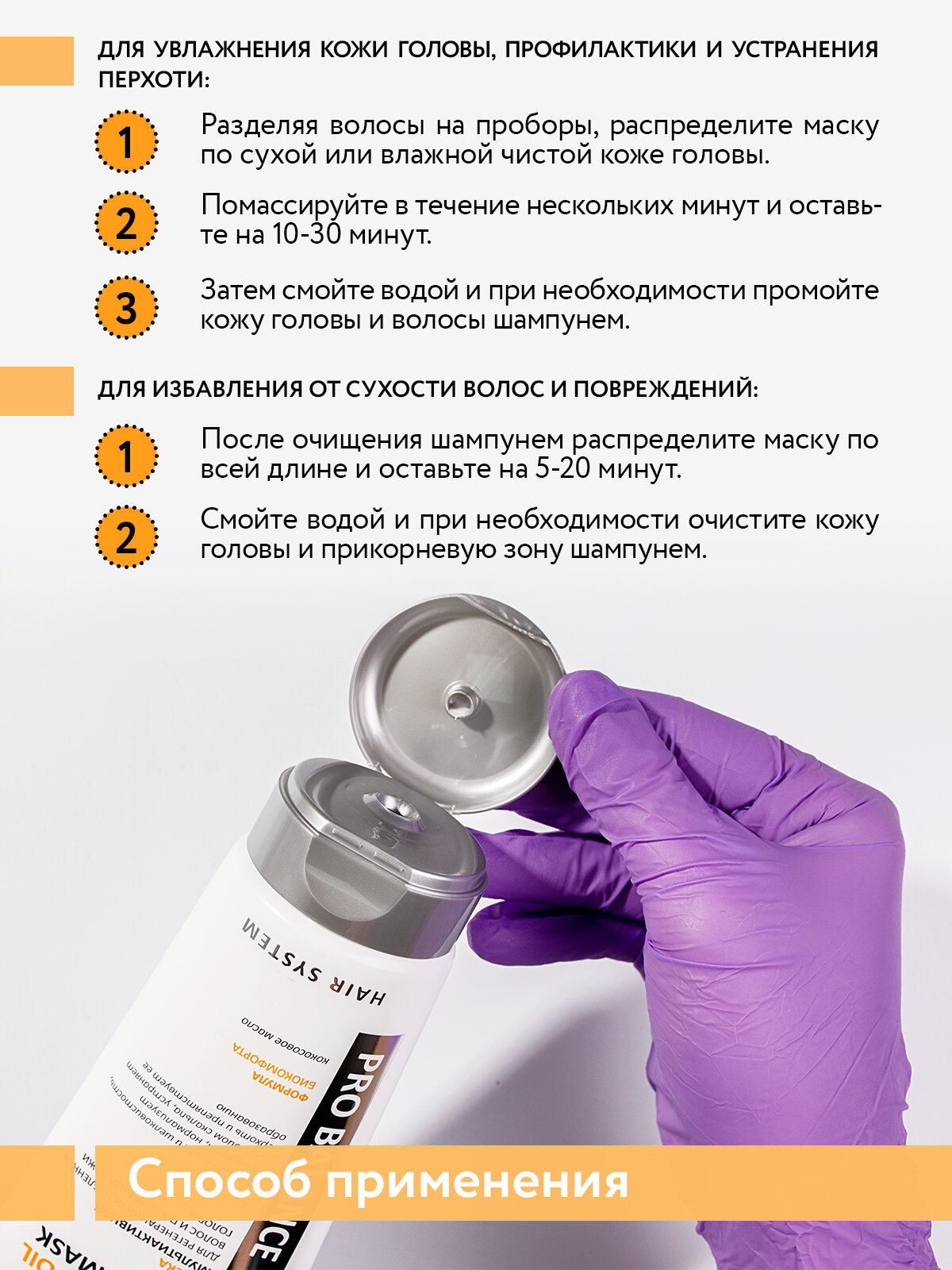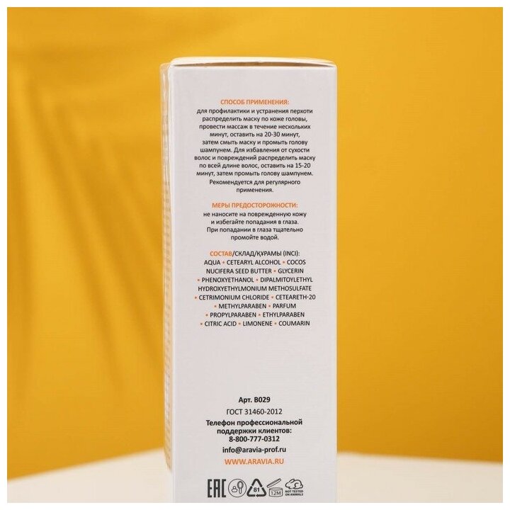 | Применение | для профилактики и устранения перхоти:разделяя волосы на проборы, распределите маску по коже головы. Помассируйте в течение нескольких минут и оставьте на 10-30 минут. Затем смойте водой и очистите кожу головы и волосы шампунем. Для избавления от сухости волос и повреждений:после очищения шампунем распределите маску по всей длине и оставьте на 5-20 минут. Смойте водой и при необходимости очистите кожу головы и прикорневую зону шампунем. Рекомендуется для регулярного применения. |