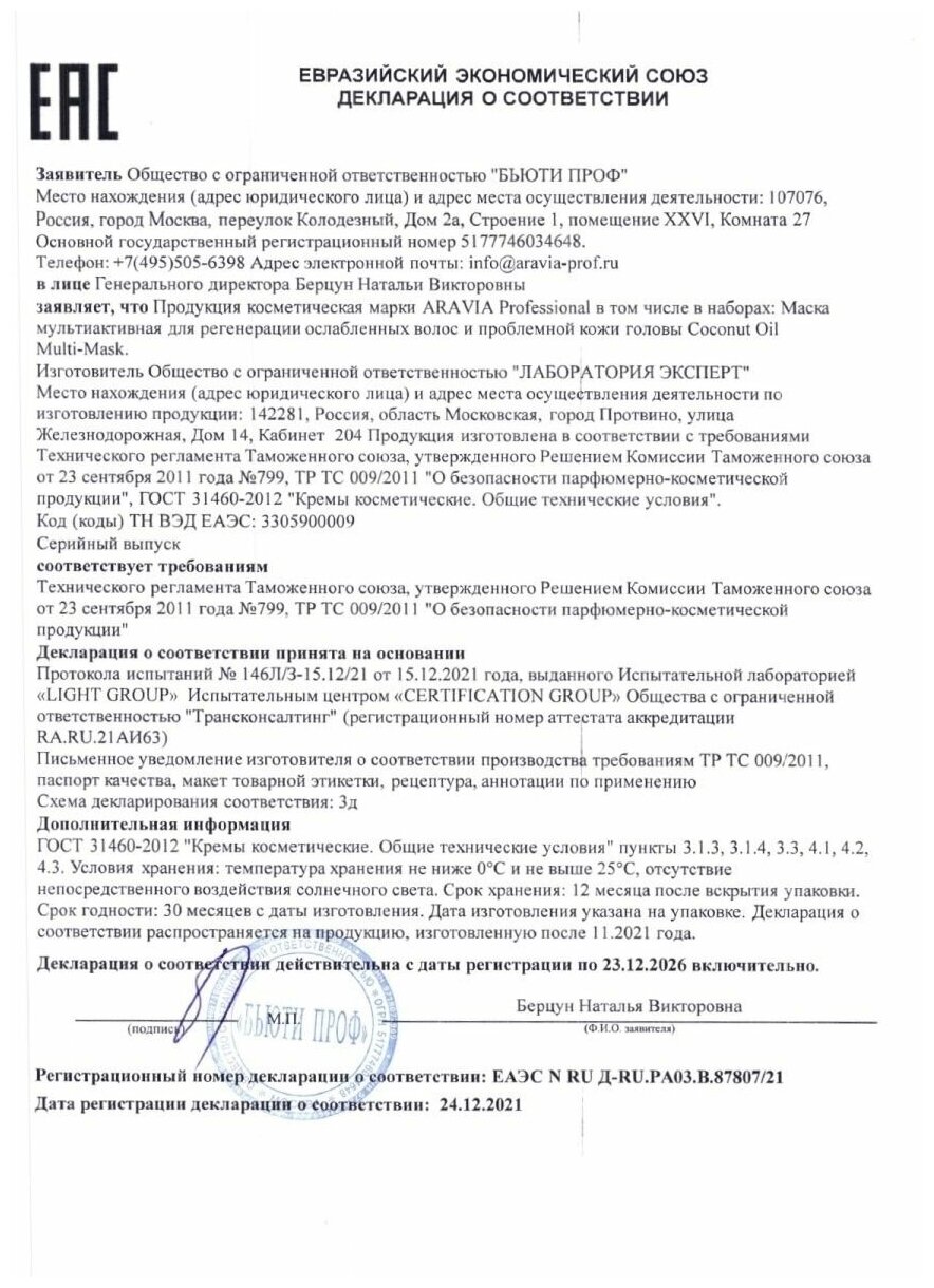| Коллекция | Aravia Professional COCONUT OIL MULTI-MASK |