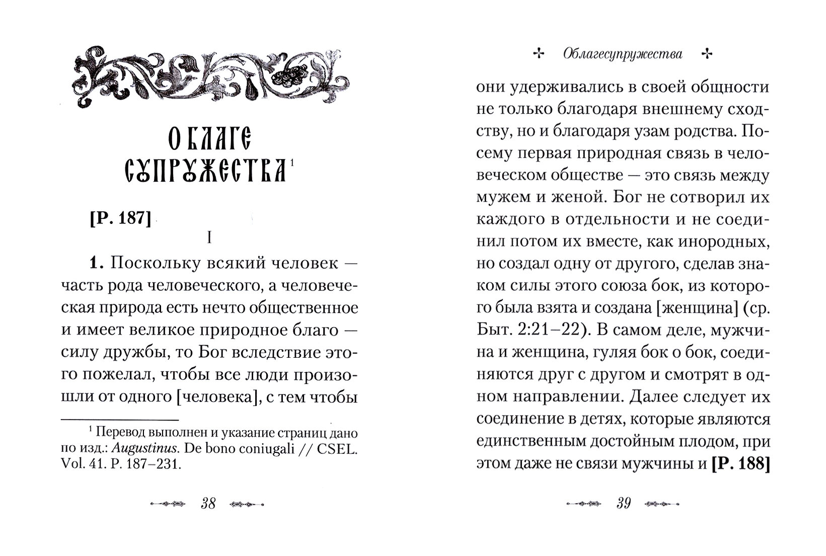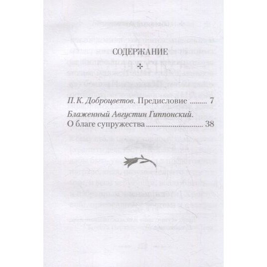 На русском языке впервые издается небольшое сочинение великого святого отца Западной Церкви IV-V вв. блаженного Августина, епископа Гиппонского (354-430), "О благе супружества". В нем святой отец излагает свое учение об основах христианского брака. Он рассматривает брак как благо, соответствующее воле Божией и природе человека, и видит в нем "пространство" для реализации любви и единения супругов, средство должного направления чувственного влечения и законного деторождения. Говорит блаженный Августин и об угрозах для христианского брака: необузданной похоти, прелюбодеянии и др. Свои размышления он основывает на Священном Писании.