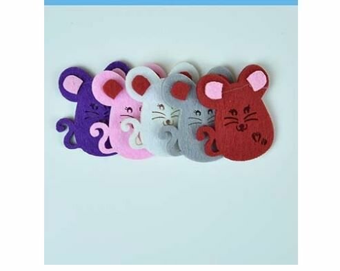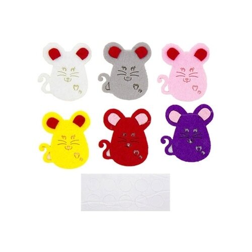 Мышки вырезаны из плотного фетра. Высота примерно 4,5 см. Рисунок мордочки прорезан, а не нарисован. Приклеены ушки. В наборе есть двухсторонний скотч.