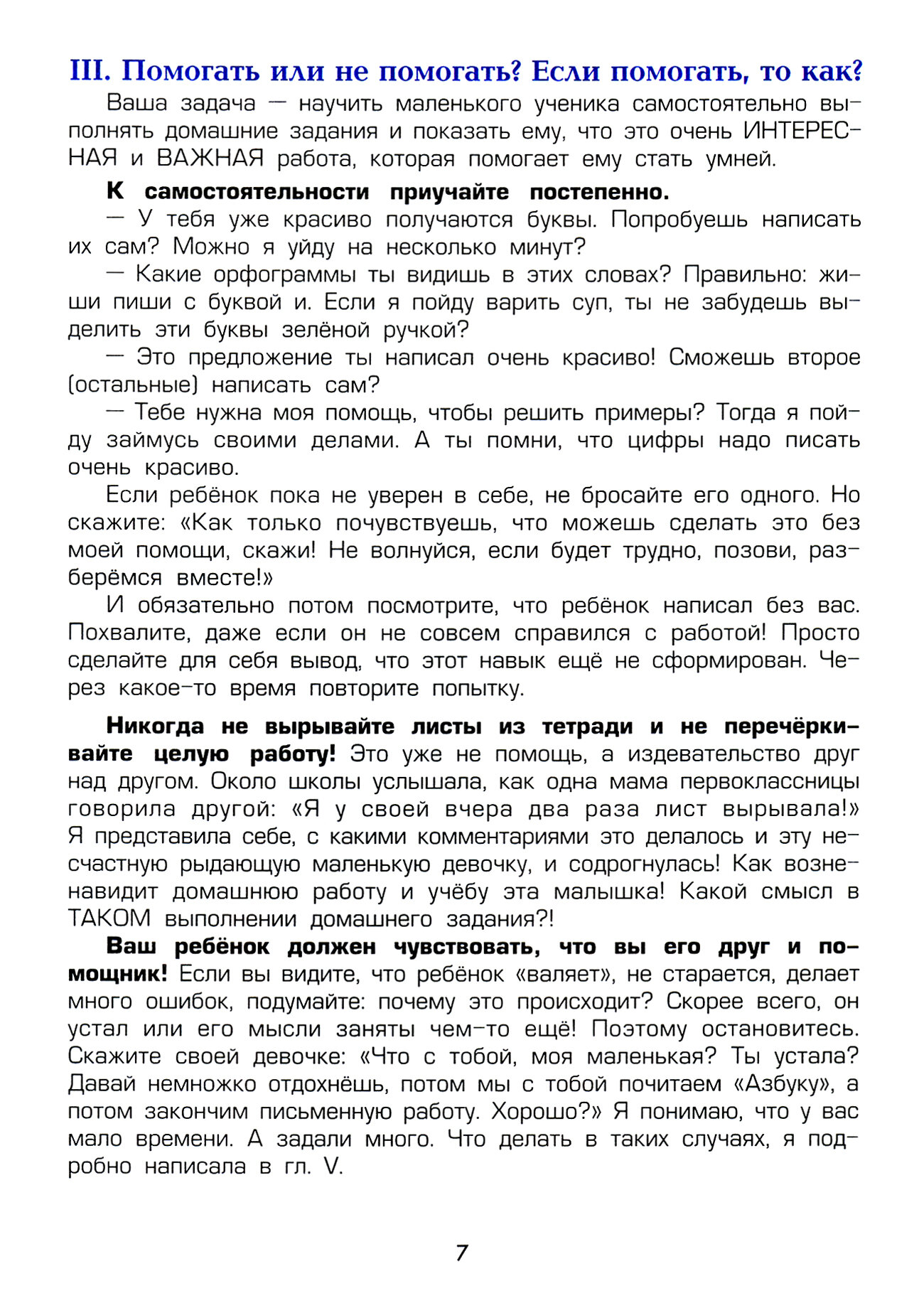 Татьяна Васильевна Шклярова- известный автор, педагог, написавшая немало обучающих пособий по русскому языку и т.п. Поэтому мне стало очень интересно почитать её опыт обучения своего внука-первоклассника. Одно дело- обучать чужих детей, другое дело- помочь своему любимому внуку адаптироваться в первом классе. Опыт из первых рук. Это дорогого стоит. По сути это советы, памятки для работы с детьми-первоклассниками. Всё конкретно, чётко. В конце книги дан список книг, которые стоит почитать с ребёнком в этот период. Чтению в книге уделено достаточно внимания. Ведь автор-педагог, понимающий важность чтения, особенно совместного чтения с детьми на ночь. В конце книги также даны памятки по запоминанию. Книга на скрепке, бумага белая, чуть просвечивает. Рекомендую!