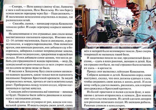 В книге кратко описана судьба одного из пяти детдомовцев, оказавшихся в первые дни войны в Брестской крепости. А ведь ему на тот момент было 12 лет. Шрифт крупный, смогут прочитать дети начальной школы. Иллюстрации яркие, использованы кадры из фильмов и репродукции картин. Всё отлично, только цена больно уж высока для 16 страниц. В книге есть слова, которые требуют пояснения для младших школьников. Например, что такое НКВД и т.д.