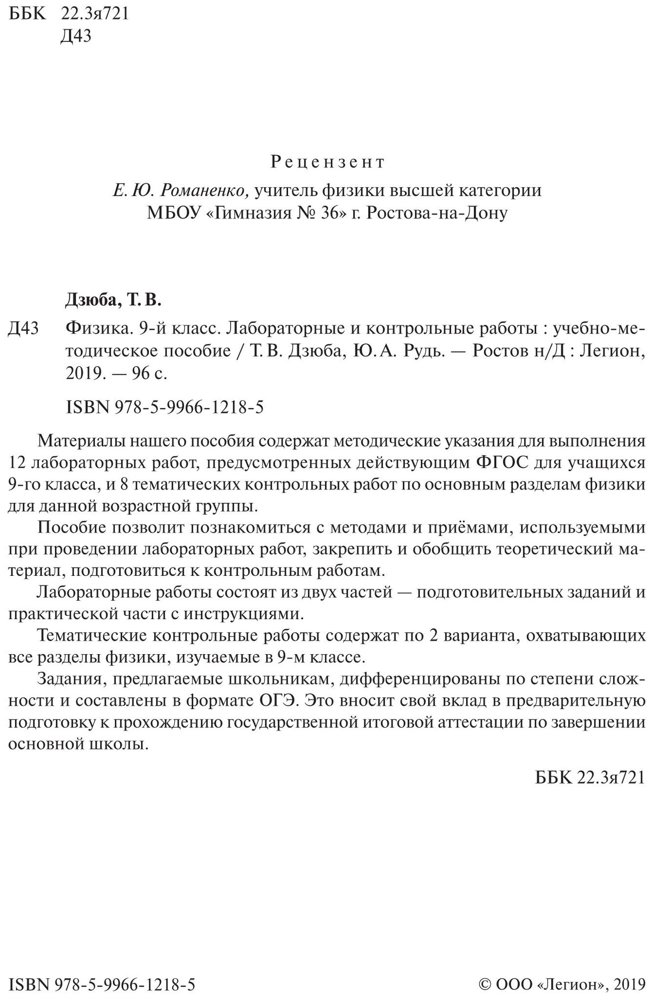 Физика. 9 класс. Лабораторные и контрольные работы (Рудь Юлия Анатольевна, Дзюба Татьяна Владимировна); Легион, 2019