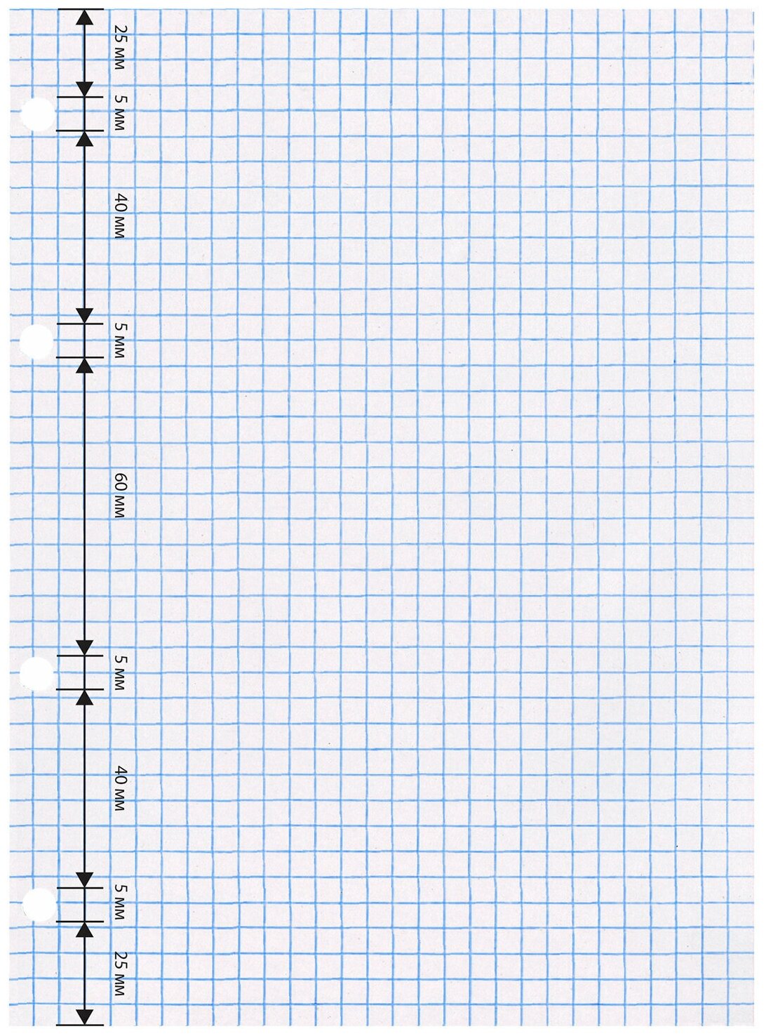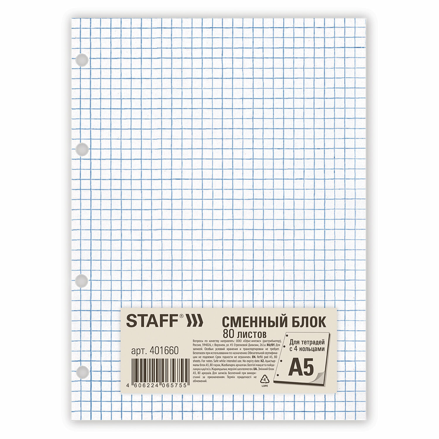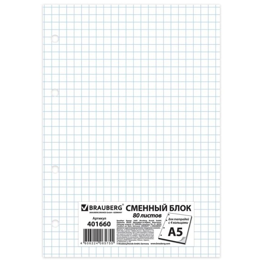 Подходит для всех тетрадей на кольцах формата А5. Внутренний блок содержит 160 листов белой, офсетной бумаги плотностью 60 г/м2. Линовка — в клетку без полей. Упакован в термопленку.