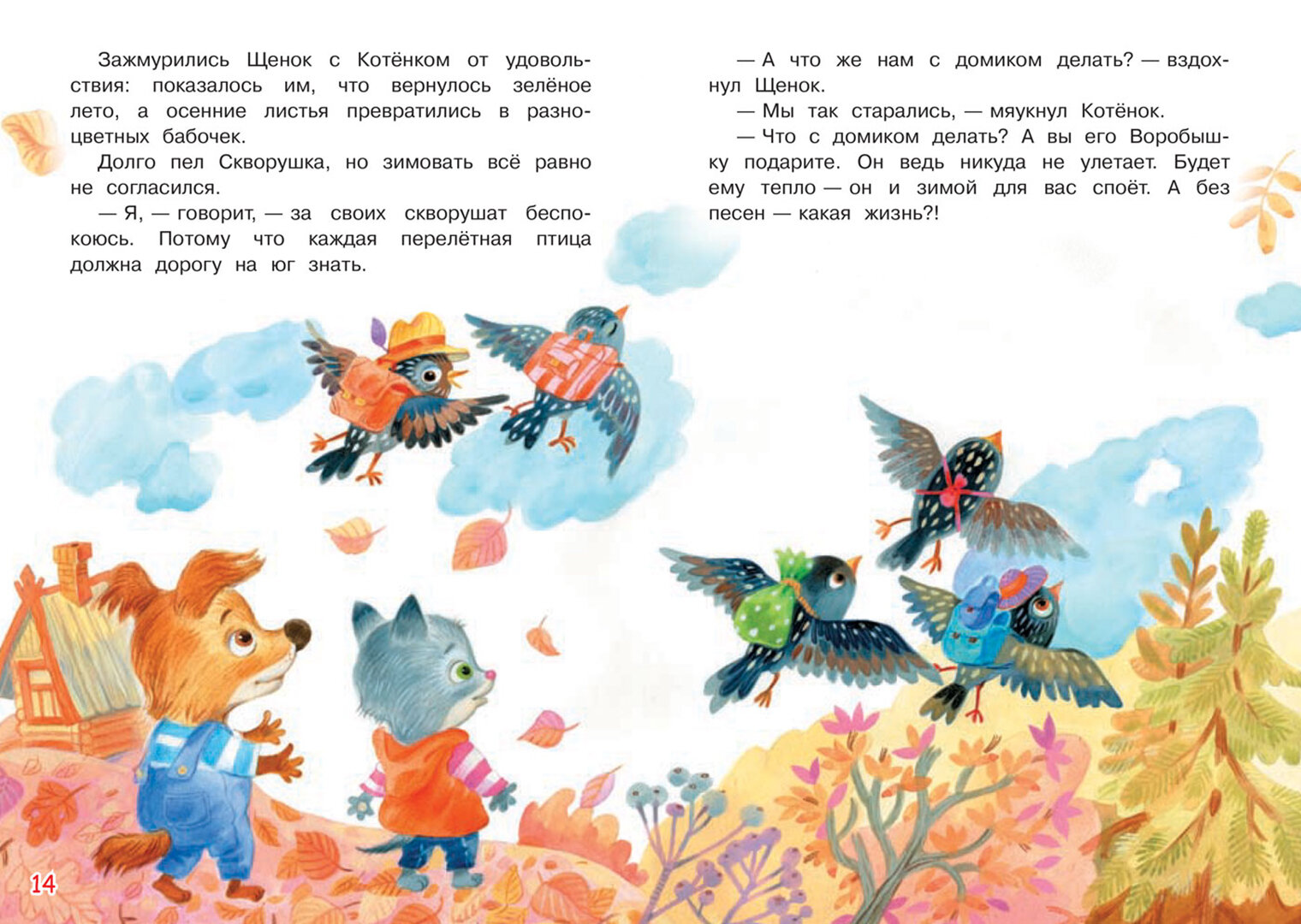 Очень не хотелось Щенку и Котёнку расставаться со своим другом Скворушкой и его чудесными песнями: ведь тот собирался улететь на зиму в тёплые края. Вот и построили они для него надёжный домик. Но всё же Скворушке пришлось улететь со своими птенцами на юг, спасаясь от зимних холодов. Но что же теперь делать с домиком и кто будет в нём жить? И снова на выручку приходят доброта и желание помочь другим. В домике появляется его новый обитатель, а Щенок и Котёнок не только находят ещё одного друга, но и продолжают слушать чудесные песни, которые снова звучат здесь.
